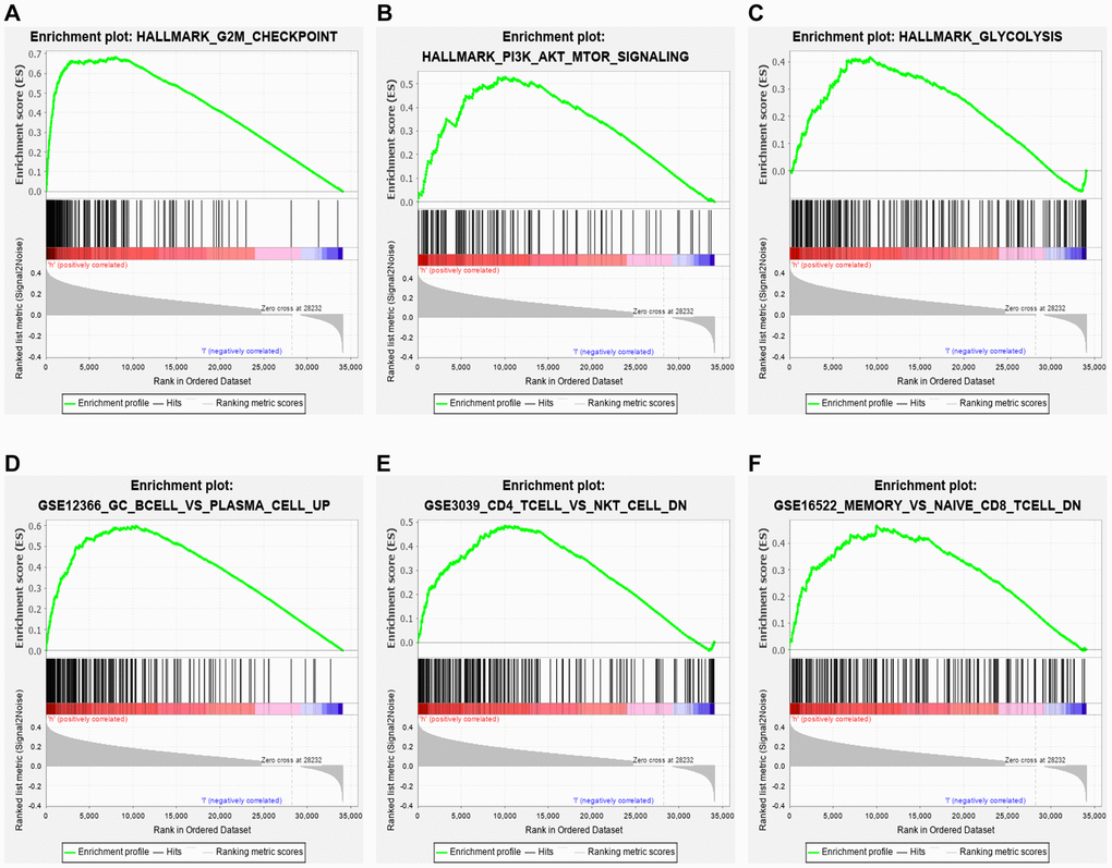 Hallmark enrichment analysis (h.all.v7.2.symbols) in this study revealed that the high-risk group was primarily linked with G2M checkpoint, PI3K/AKT/MTOR signaling pathway, glycolysis, and some canonical signaling pathways (Figure 6A–6C). These findings might help to understand the biological functions of the ceRNA-and-immune-related signature. In addition, our signature also regulated some immunologic signatures (c7.all.v7.0.symbols), such as germinal center (GC) B cell vs. plasma cell up, memory vs. naïve CD8 T-cell down and CD4 T-cell vs. NK T-cell down, demonstrating that the lncRNA signature might play an essential role in immune-related regulation (Figure 6D–6F).