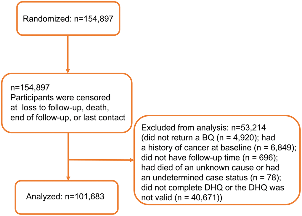 Participants were excluded from this study if they did not return a BQ (n = 4,920); had a history of cancer at baseline (n = 6,849); had no data on follow-up time (n = 696); had died from unknown causes or had an undetermined case status (n = 78); did not complete DHQ or the DHQ was not valid (n = 40,671). Finally, this study comprised 101,683 participants in total. The detailed process of subject selection has been shown in Figure 1.