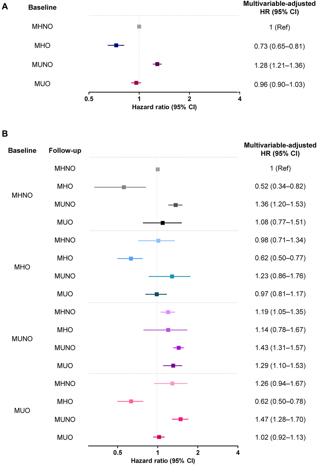 | Baseline category BMI Metabolic health status | MHNO <25 kg/m2 0–1 risk factors | MHO ≥25 kg/m2 0–1 risk factors | MUNO <25 kg/m2 ≥2 risk factors | MUO ≥25 kg/m2 ≥2 risk factors | |||||||||||||||||||||||||||||||||||||||||||||||||||||||||||||||||||||||||||||||||||||||||||||||