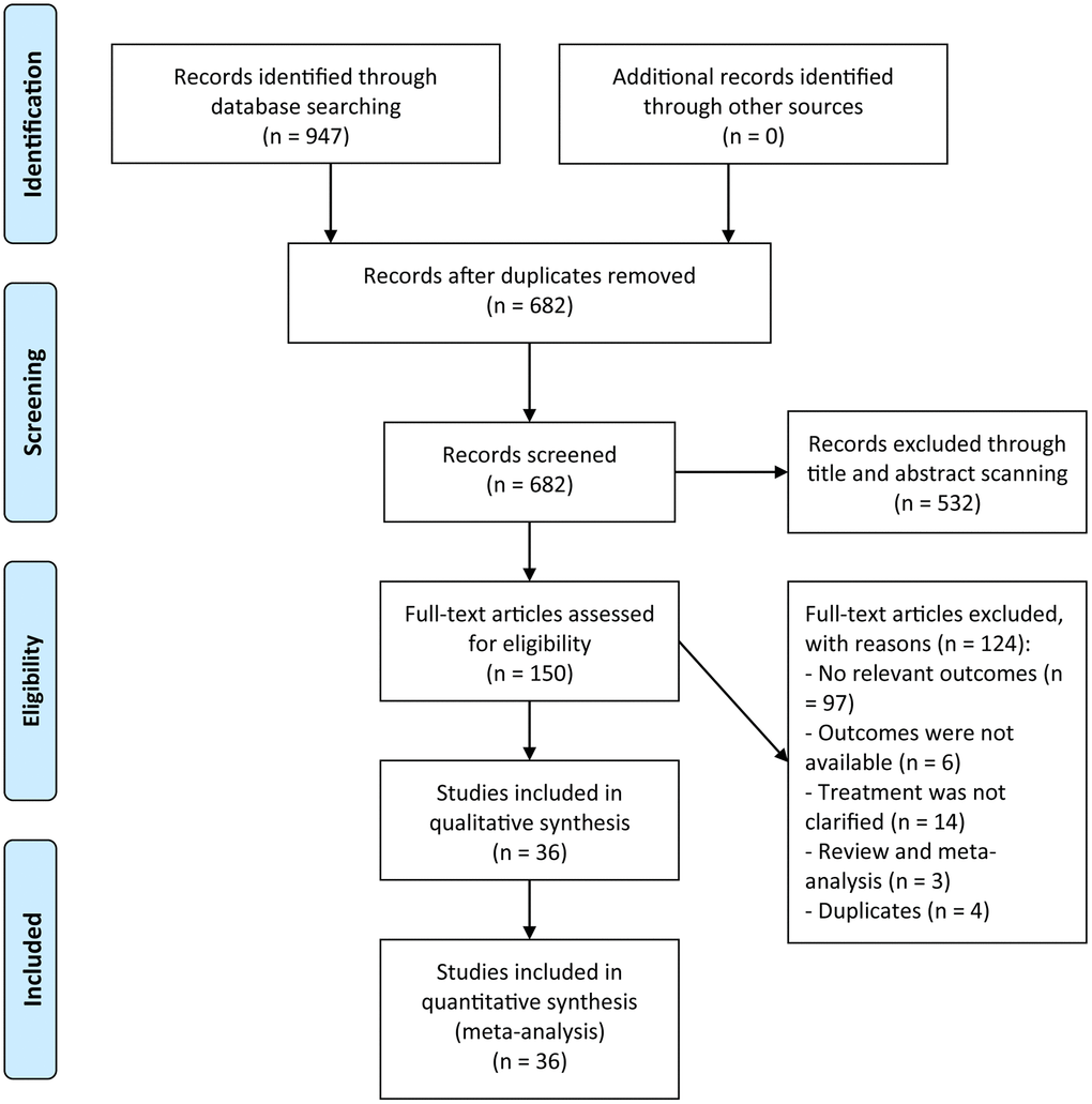 A flow chart of study selection was presented in Figure 1. The initial searching retrieved 947 relevant studies. After the removal of duplicated studies, 682 studies remained, of which 532 studies were ruled out after a scanning of the titles and abstracts. Full-test article evaluation for eligibility were implemented in 150 studies, among which 124 studies were removed owing to 97 studies with no relevant outcomes, six with unavailable outcomes, 14 without clarifying treatment types, three being review or meta-analyses, and four duplicates. Eventually, a total of 36 studies were of eligibility and enrolled into the meta-analysis [16–51].