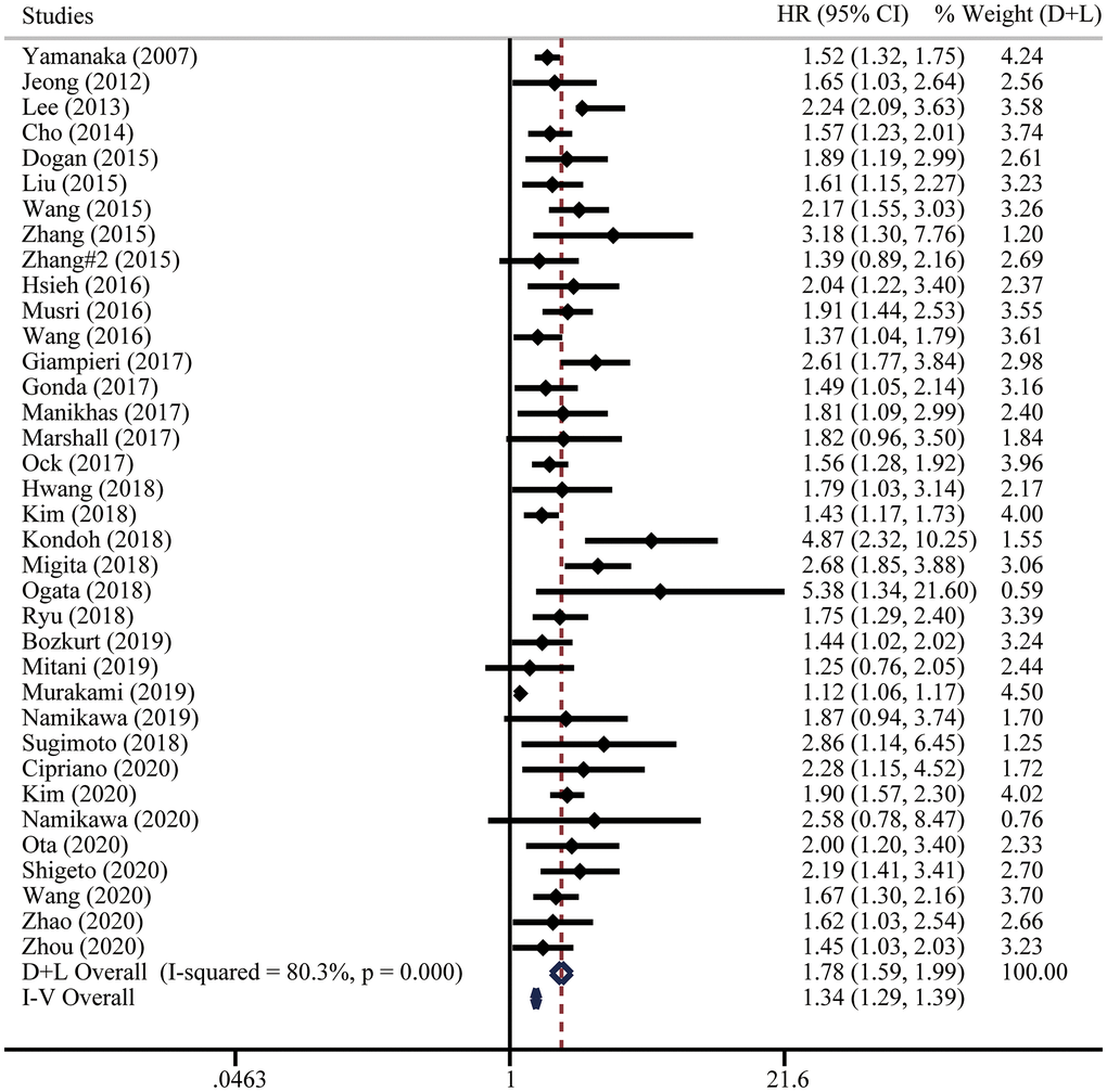 Thirty-six studies comprising of 8614 gastric cancer patients reported the association between pretreatment NLR and OS. With great heterogeneity (I2 = 80.3%, P < 0.001), we utilized random effect model to analyze the pooled hazard ratio (HRs) and results showed that higher pretreatment NLR was correlated with a poorer OS (HR = 1.78, 95% confidential interval (CI) = [1.59, 1.99]) (Figure 2). Analysis with fixed effect model showed a consistent conclusion (Figure 2). The conclusion also remained unchanged with sensitivity analysis (Supplementary Figure 1A).