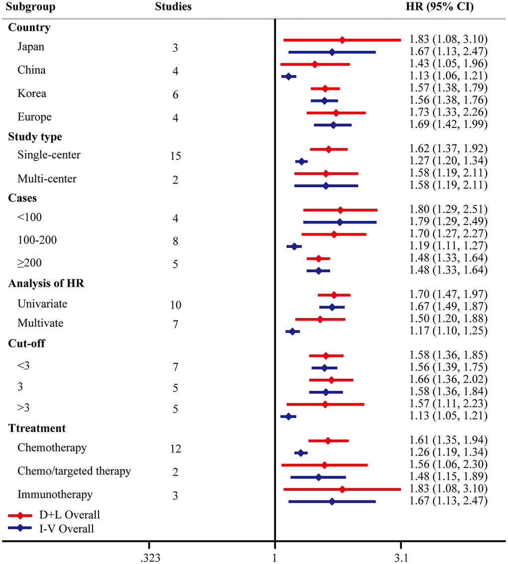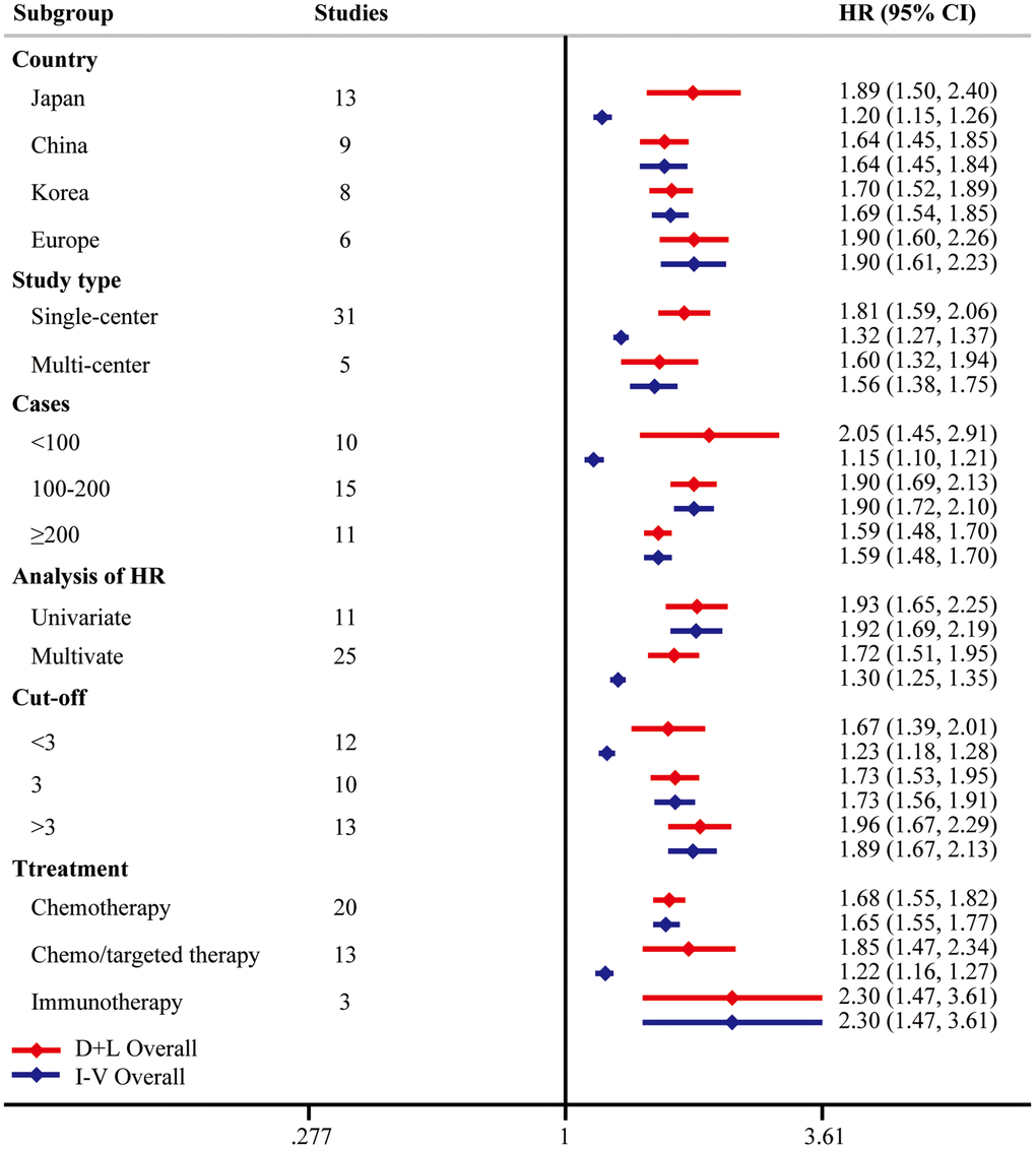 Considering the existence of heterogeneity, univariate meta-regression analysis was performed and indicated that case load and cutoff of pretreatment NLR could be the possible significant moderators (Table 3). Then we adopted subgroup analyses following these clinical parameters. Notably, higher pretreatment NLR was correlated with poorer OS from multi-center studies (HR = 1.60, 95% CI = [1.32, 1.94]) and multivariate analysis (HR = 1.72, 95% CI = [1.51, 1.95]). Moreover, subgroup analysis on the basis of the NLR cutoff values demonstrated that the prognostic value of pretreatment NLR consisted in all the NLR groups (<3 HR = 1.67, 95% CI = [1.39, 2.01]; = 3 HR = 1.73, 95% CI = [1.53, 1.95]; >3 HR = 1.96, 95% CI = [1.67, 2.29]). Subgroup analysis by treatment types suggested the same conclusions in chemotherapy (HR = 1.68, 95% CI = [1.55, 1.82]), chemo/targeted therapy (HR = 1.85, 95% CI = [1.47, 2.34]), and immunotherapy (HR = 2.30, 95% CI = [1.47, 3.61]). The results of subgroup analyses were summarized in Figure 3, highlighting that elevated pretreatment NLR was correlated with poor OS.