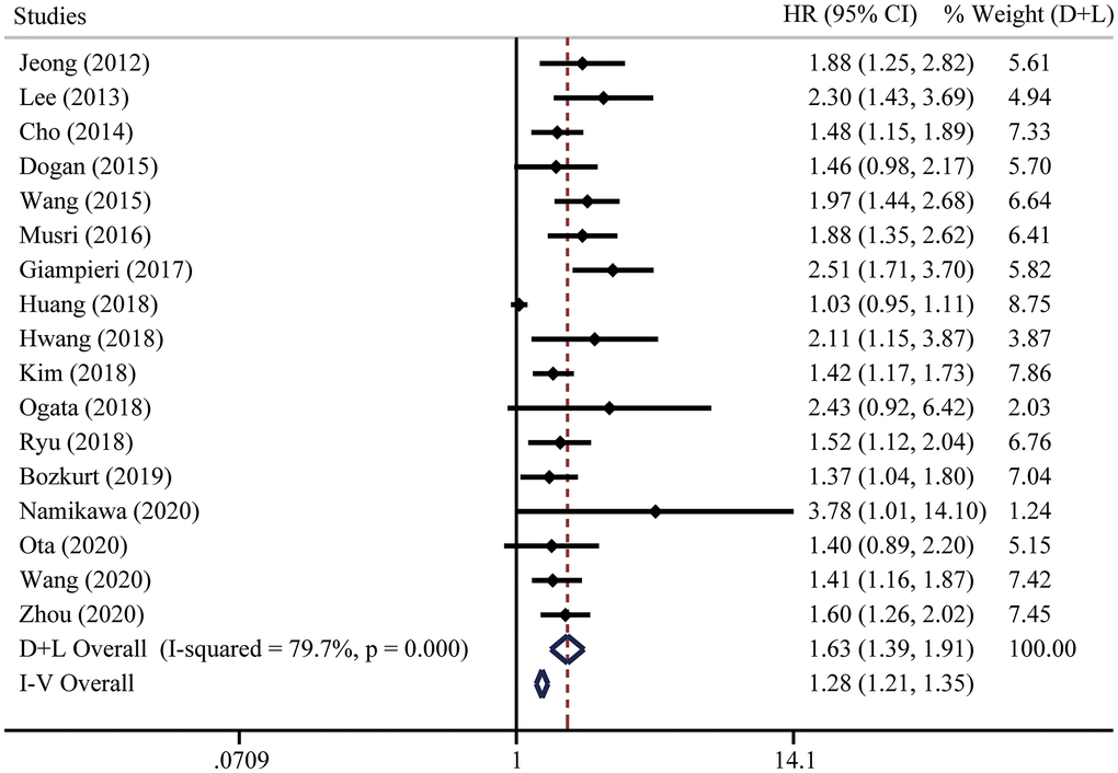 For PFS subset, the funnel plot was not symmetrical and five studies were over the pseudo 95% CI (pseudo 95% CI was defined as 95% CI assuming these included studies did not have heterogeneity [53]) (Supplementary Figure 2B). We then performed the Egger’s test, which detected the existence of publication bias (P < 0.001) (Supplementary Figure 2C). Twelve studies were filled after the Duval and Tweedie trim-and-fill method. The conclusion remained consistent in both fixed effect model (HR = 1.27, 95% CI = [1.20, 1.34]) and random effect model (HR = 1.55, 95% CI = [1.34, 1.80]).