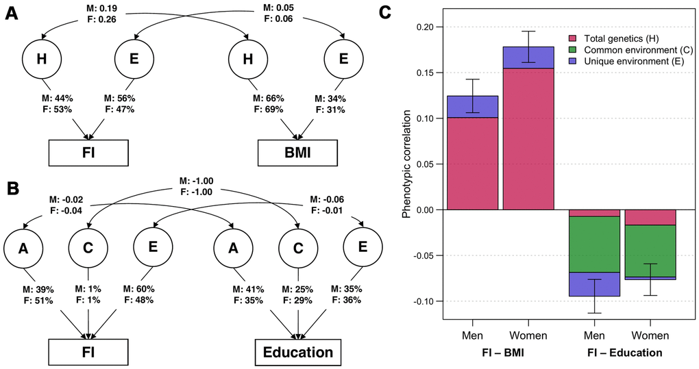 Within-individual between-trait correlations, which we refer to as “phenotypic correlations”, were calculated for FI with BMI and education. To explore the genetic and environmental sources of covariances, we computed cross-twin cross-trait correlations, which represent the strength of relationship between one trait of the first twin and another trait of the second twin. They can be interpreted in a similar way as intraclass correlations. For example, a larger cross-twin cross-trait correlation in MZ than DZ twins suggests that phenotypic correlation between the two traits is partially owing to common genetic influences; and if MZ cross-twin cross-trait correlation is less than the phenotypic correlation then E is present.