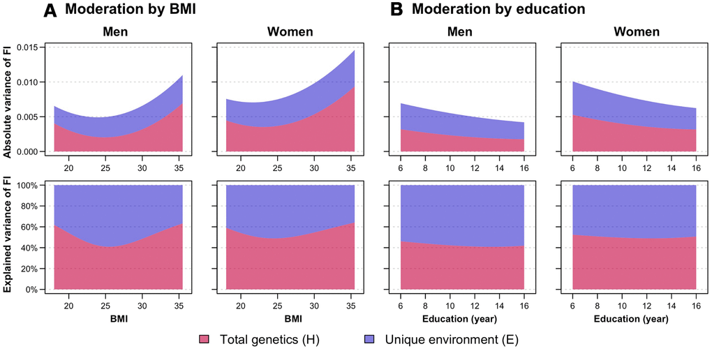 In accordance with its multifactorial nature, frailty is influenced by both genetic and environmental factors, with twin-based heritability estimates of the FI ranging from 30 to 45% [10, 11]. However, these studies included female twins only, leaving sex differences in the heritability of FI unaddressed. A vast body of literature has discerned the lifestyle and environmental determinants of frailty [12–14], and showed a persisting socioeconomic gradient in frailty, with increasing socioeconomic adversity associated with higher frailty and contributing to health inequalities even in old age [15]. Two of the most significant risk factors of frailty are unhealthy body mass index (BMI) ranges, including both underweight and obesity [16–18], and low educational attainment [12, 19–21]. A recent Mendelian randomisation analysis showed that the genetic risk of higher BMI and lower educational attainment had the strongest associations with frailty among all modifiable risk factors [22]. However, few studies have elucidated the mechanisms by which these risk factors influence frailty, and whether there may be overlap in the genetic and/or environmental underpinnings of FI with BMI and education. Moreover, it is not known whether the genetic and environmental influences on the FI are altered by BMI and education levels, that is, whether there is gene-environment interaction (G×E) such that genetic risk of frailty may be amplified or suppressed with different environmental circumstances. It is also unclear whether men and women may differ with respect to G×E.