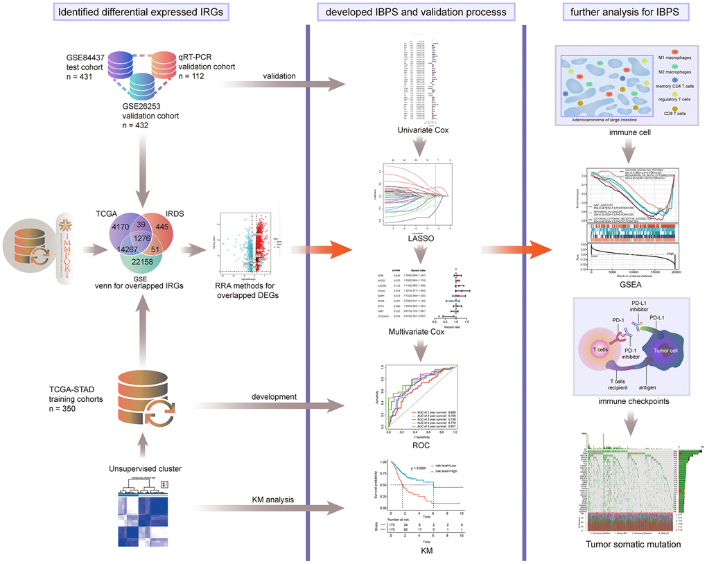 A comprehensive analysis in terms of the immune genes and TME in GAC and the development of a prognostic signature based on the immune gene sets (IBPS) for GAC can improve clinical risk stratification in patients with GAC and allow possible biotherapy targets to be explored. In the present study, we integrated 894 GAC patients with overall survival (OS) data and 432 patients who had recurrence-free survival (RFS) data from 5 independent cohorts, including a dataset from The Cancer Genome Atlas (TCGA), GSE84433, GSE84426, GSE26253, and 145 frozen tissue samples, for a purpose of developing and validating a novel individualized IBPS. We also performed an investigation as to the pathological characteristics, immune landscape, and also the landscape of somatic mutations in the signature.