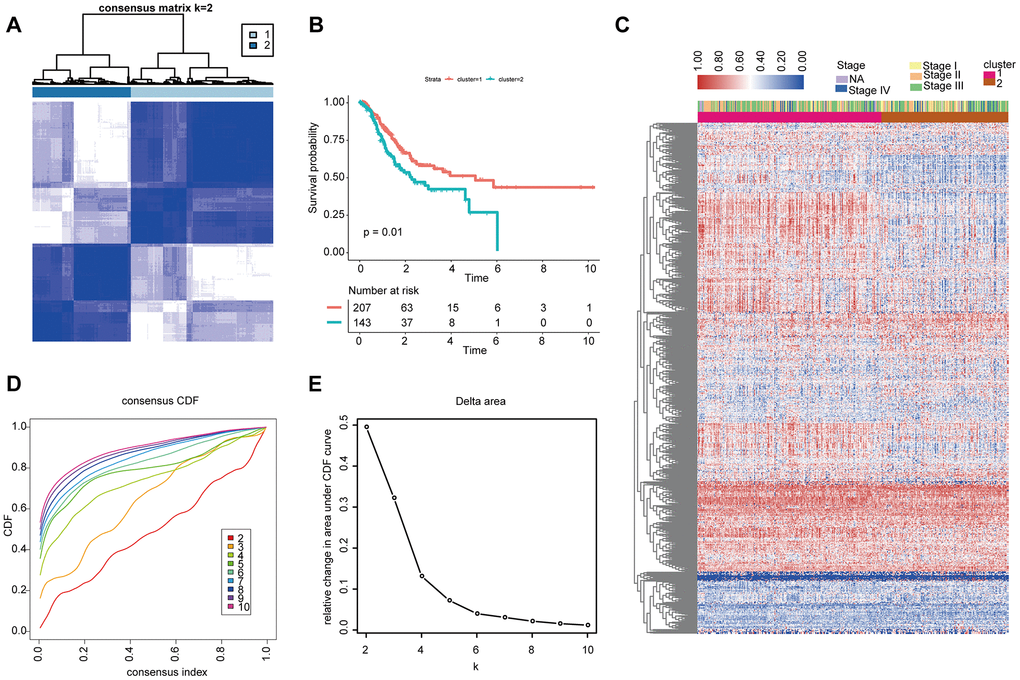 We use the mRNA matrix data downloaded from the TCGA and GEO databases and the IRGS to intersect. The patients were analyzed by unsupervised cluster analysis according to the expression of IRGS. The consistent clustering algorithms were adopted for determining the clusters in terms of their quantity and stability [37]. We performed the above analysis using the ConsensusClusterPlus package [38] and repeated the analysis for 1000 times for ensuring the classification stability.
