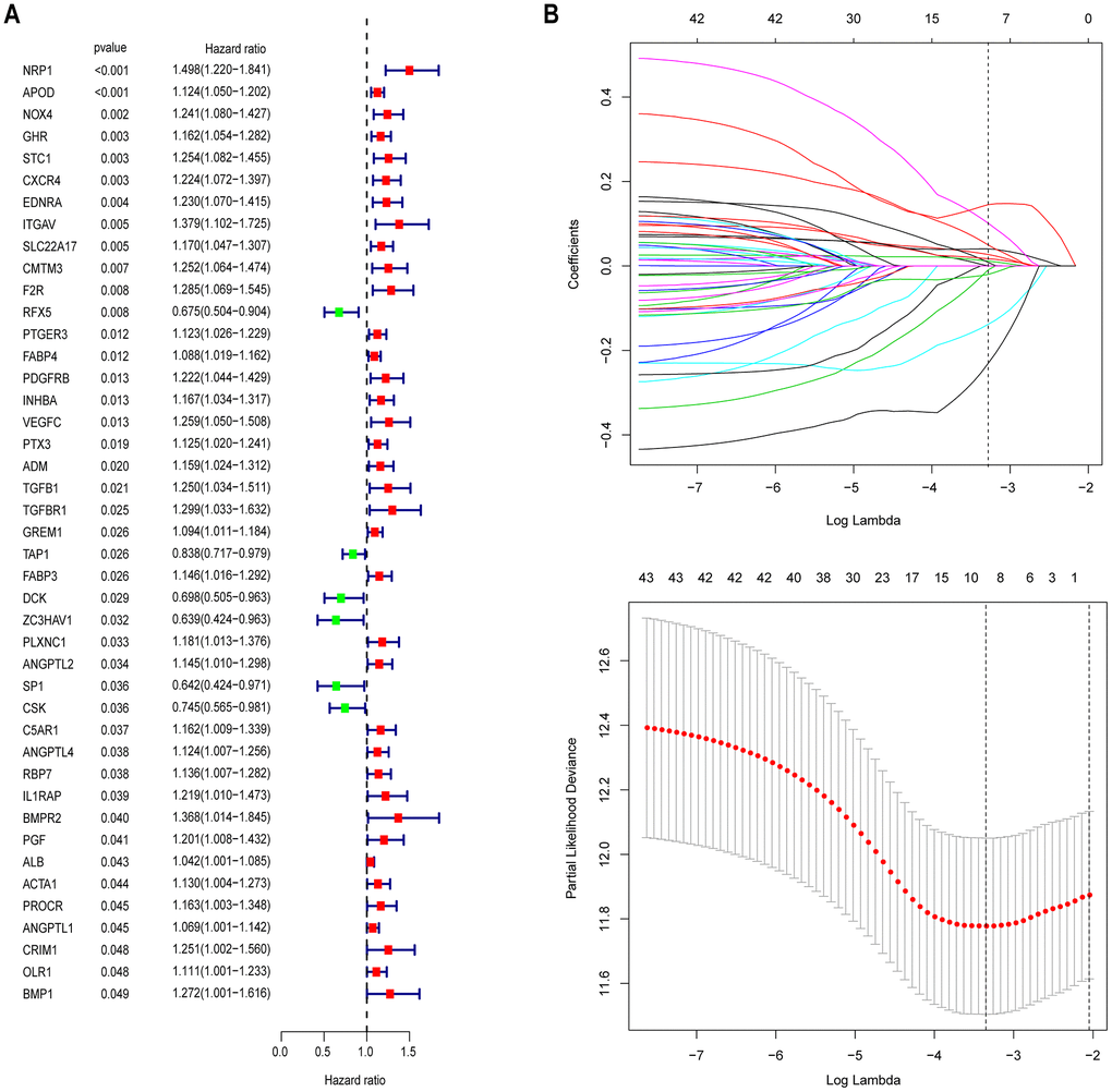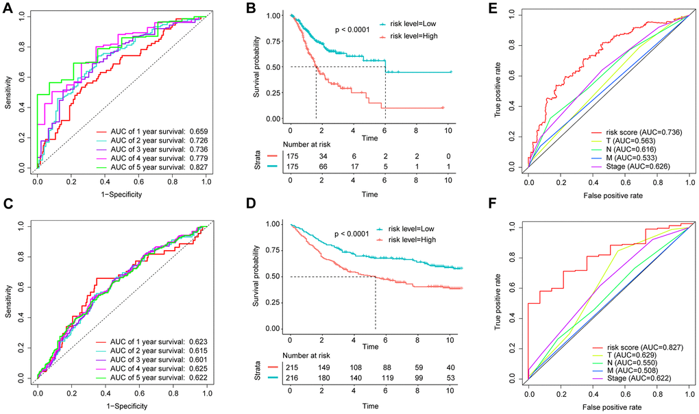 We use R packages "glmnet," "survminer," and "survival." to perform the univariate and multivariate COX regression analysis. The ROC curves and the corresponding AUC were generated with the R package “survivalROC”.