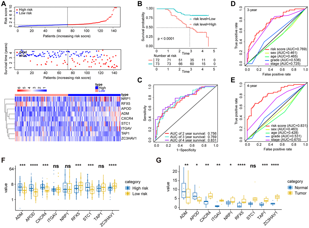 For a validation of the IBPS in terms of its robustness, we conducted the same analysis with the qRT-PCR validation cohort (n = 145) (Figure 5A, 5B). The AUCs for the prediction of 3- and 4-year survival by the IBPS reached 0.769 and 0.831, respectively (Figure 5C), which were larger compared to the system of the traditional TNM pathological staging (Figure 5D, 5E). Furthermore, when applied to subcategories of patients with GAC in different pathological stages at the time of diagnosis and other different clinical subgroups, the risk score was predictive of significantly different OS outcomes (Supplementary Figure 9, P < 0.05). We compared the expression of 9 IRGs in gastric cancer tissues to their corresponding normal tissues (Figure 5F). We also compared the differential expression of 9 IRGs between the two groups (Figure 5G).