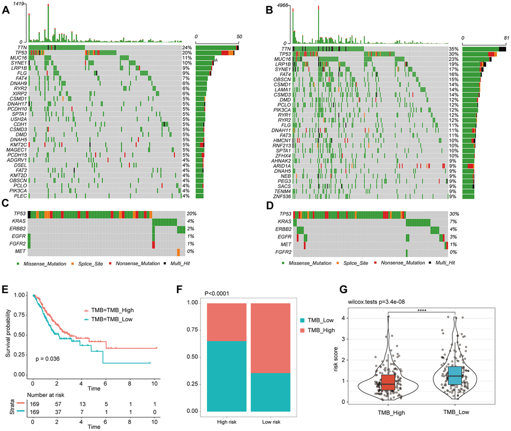 Then, we used the maftools software package to analyze the difference in the distribution of somatic mutations between the low-risk score group and the high-risk score group in the TCGA-STAD cohort. Supplementary Figure 16A shows the top 30 gene mutations in the TCGA-STAD cohort. The top 30 gene mutations in the high-risk score group and the low-risk score group are shown in Figure 6A, 6B, respectively. Somatic mutations were altered in 355 of 427 samples (83.14%). The well-known oncogenes TP53, ERBB2, EGFR, FGFR2, MET, and KRAS [9] in GAC were altered in 182 of 427 samples (42.62%) (Supplementary Figure 16B), especially TP53 (Figure 6C, 6D). Kaplan-Meier curve analysis suggests that patients with a high TMB have significantly better OS than patients with a low TMB (Figure 6E). And there was lower TMB observed in the high risk score group compared to the low risk score group (P < 0.0001, Figure 6F). What's more, the high TMB group had lower risk scores compared to the low TMB group (Figure 6G). Besides, we explored that the mutational rates of the 9 IRGs in the IBPS were very low (Supplementary Figure 16C), supporting their use as diagnostic or prognostic biomarkers.