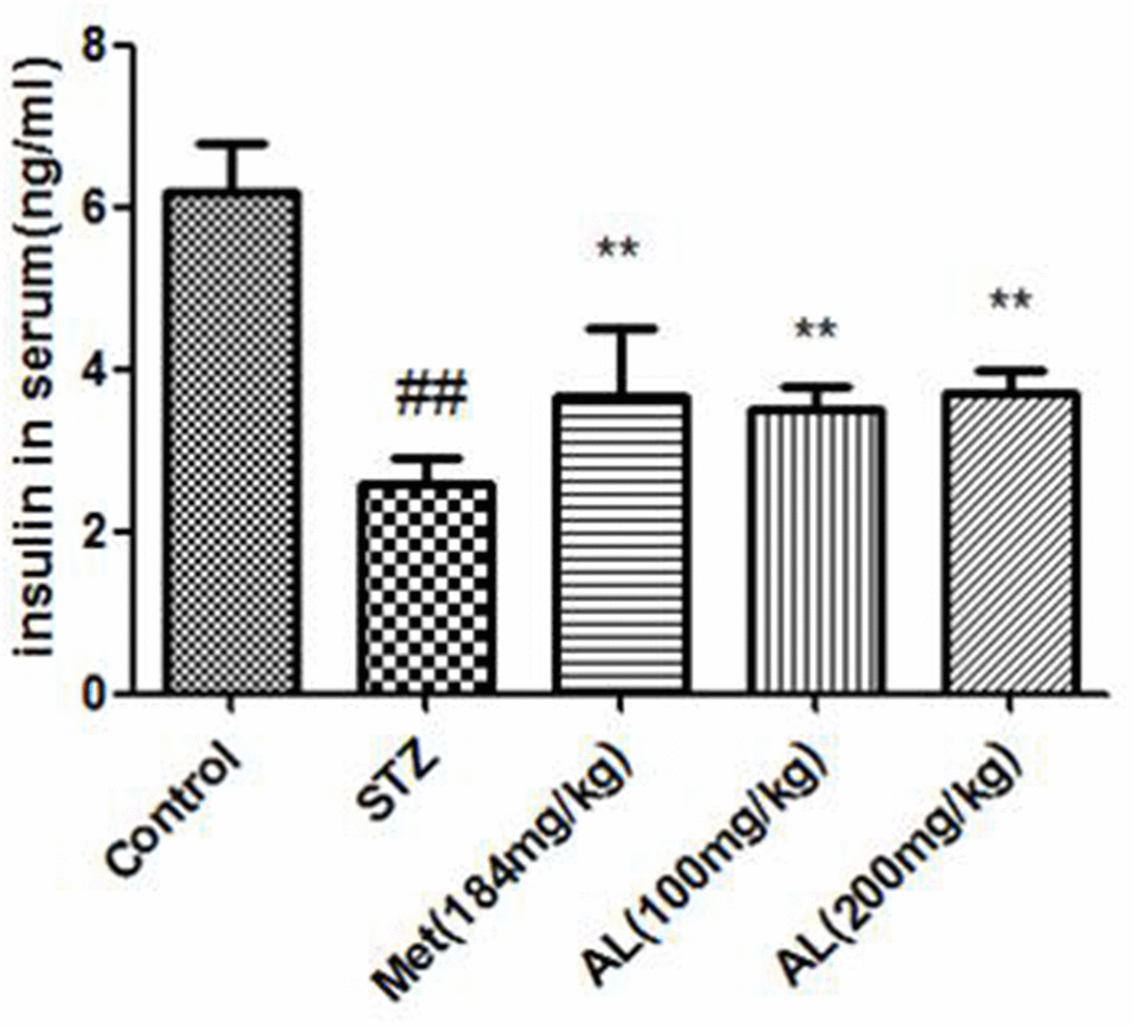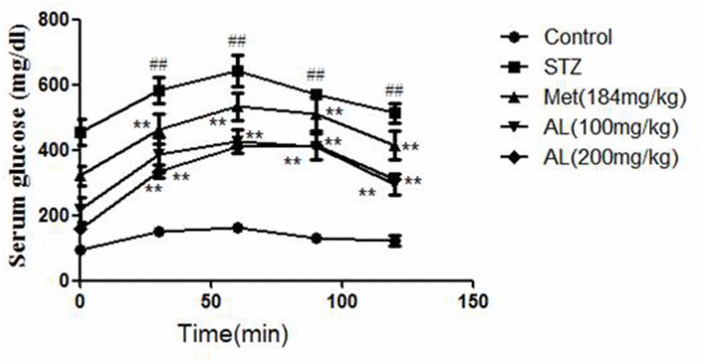 Compared with the control group, the serum insulin in the model group was significantly decreased. As expected, AL and Met markedly increased the serum insulin level. In OGTT experiment, the blood glucose of model group rats was higher than that of control group rats within 30, 60 and 90 minutes, and the above changes were obviously changed by AL and Met (Figures 1, 2).