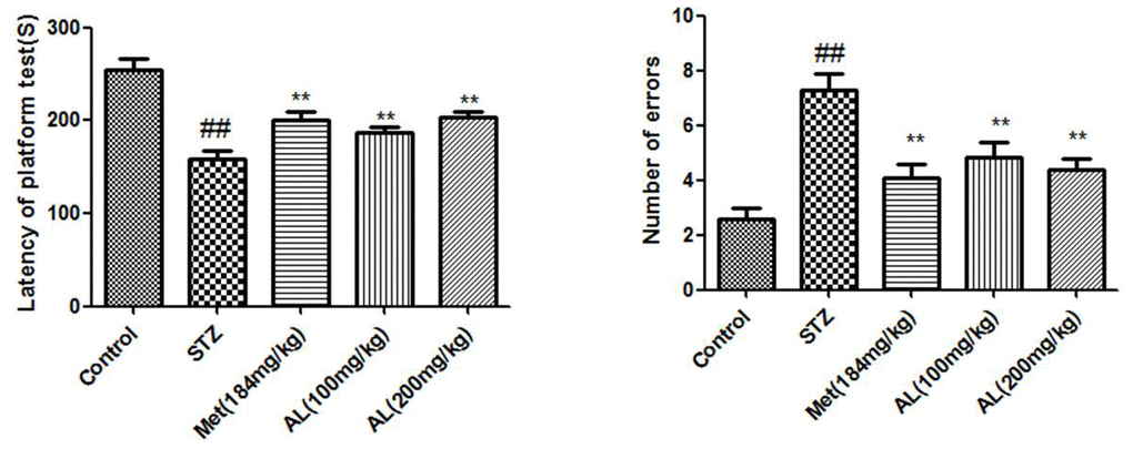In the platform test, compared with the control group rats, the latent period (seconds) of the model group was significantly shortened, while the latent period of the AL and Met groups rats was significantly increased. Relative to the control group, the numbers of errors in the model group were significantly increased, while the number of errors in the AL and Met groups decreased markedly. Compared with normal group rats, the latency of model group rats was significantly reduced, AL and Met can obviously increase the latency of rats (Figures 3, 4).