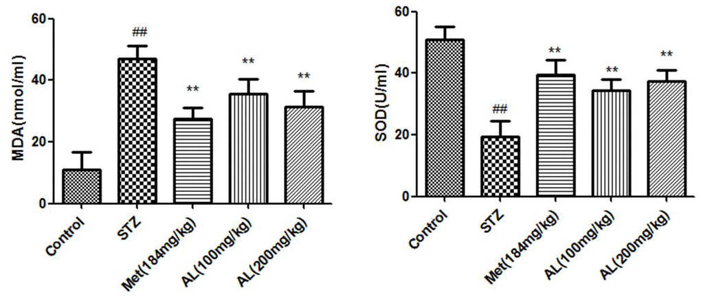 Compared with the normal rats, the serum SOD activity and MDA content in the model group were significantly decreased. However, AL and Met significantly increased the serum SOD activity and decreased the MDA content in the rats (Figure 5).