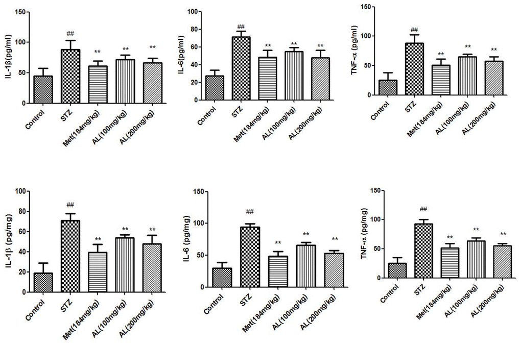 Many literatures indicate that inflammation is involved in the pathological process of cognitive dysfunction [12]. Hyperglycemia stimulates the production of TNF-α, which increases vascular permeability and neuronal damage, and aggravated cognitive impairment [13]. Some studies suggest that that cytokines are involved in cognitive dysfunction caused by multiple factors [14]. In this study, we found that AL could significantly reduce the levels of cytokines in the serum and hippocampus of diabetic rats.