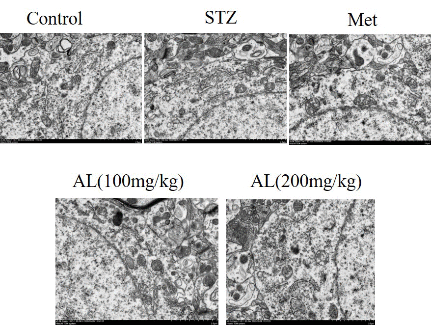 The differences in nuclei and organelles among the 3 groups were observed by transmission electron microscopy. The results showed that no morphological changes and apoptosis occurred in the CA1 neurons of the hippocampus in the control group, while a large number of cells in the model group underwent apoptosis due to morphological changes. Compared with the model group, after the treatment of AL, the diabetic rats had larger nuclei, smoother nuclear membrane, and normal cell morphology (Figure 9).