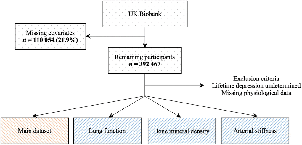 Of the 502,521 UK Biobank participants, 392,467 (78.1%) individuals had complete data on all covariates. We yielded an analytical sample of 342,393 adults after excluding individuals who did not meet our inclusion criteria or whose lifetime depression status could not be determined. Sample sizes for physiological measures that were available in subsets of the UK Biobank population ranged from 120,843 to 224,805 participants (Figure 1).