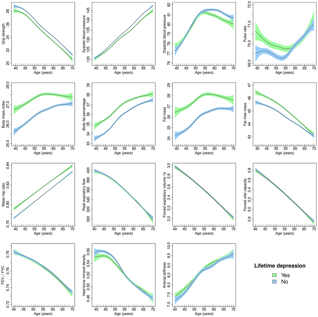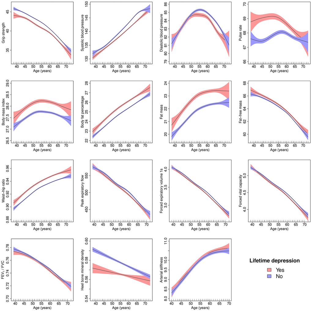 Using data from up to ~342,000 UK Biobank participants aged 37-73, the following research questions were examined for each physiological measure assessed during the baseline assessment: Are there average differences between males and females with lifetime depression and healthy controls? Do age-related changes differ between males and females with lifetime depression and healthy controls?