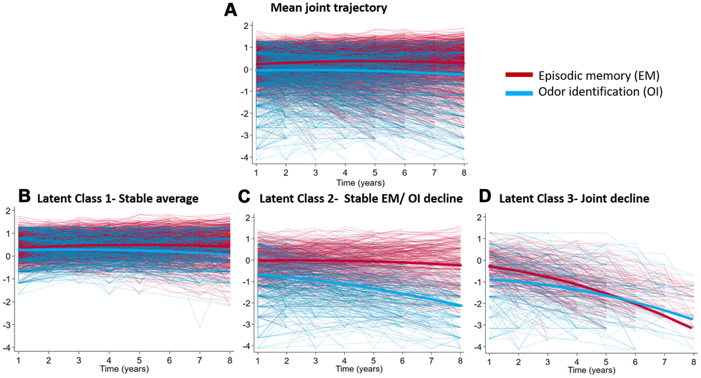 The sample characteristics of the three classes are shown in Table 1. Noteworthy is that 144 out of 690 (20.9%) participants died in Class 1 (stable average) during follow-up, 84 out of 231 (36.4%) died in Class 2 (average episodic memory/declining odor identification), and 62 out of 102 (60.8%) participants died in Class 3 (joint decline); 59 participants (8.6%) developed dementia over follow-up in Class 1, 59 (25.5%) in Class 2 and 69 (67.7%) in Class 3; participants in Class 1 were younger than those in Class 2 or 3, however the latter two classes did not differ significantly in age.