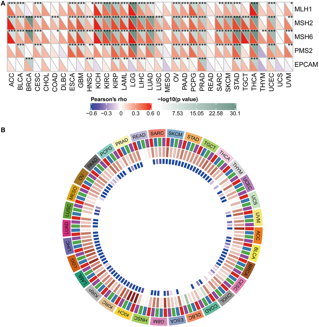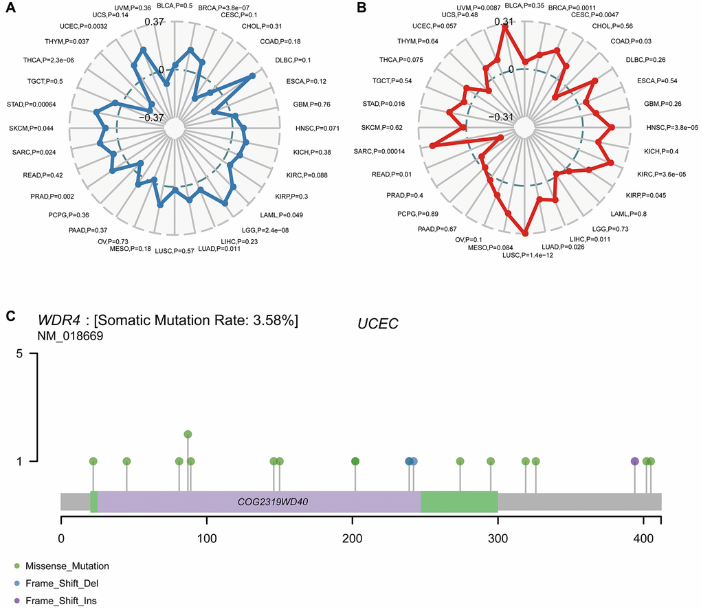 Figure 9C shows the typical presentation of UCEC, in which the somatic mutation rate of WDR4 is 3.58%. As shown in Figure 10A, the expression of WDR4 was significantly correlated with mutations in 5 MMR genes (MLH1, MLH2, MLH6, PMS2, EPCAM) in several cancer types. In addition, a close relationship was observed between WDR4 expression and mutations in 4 methyltransferases in several cancer types (Figure 10B).