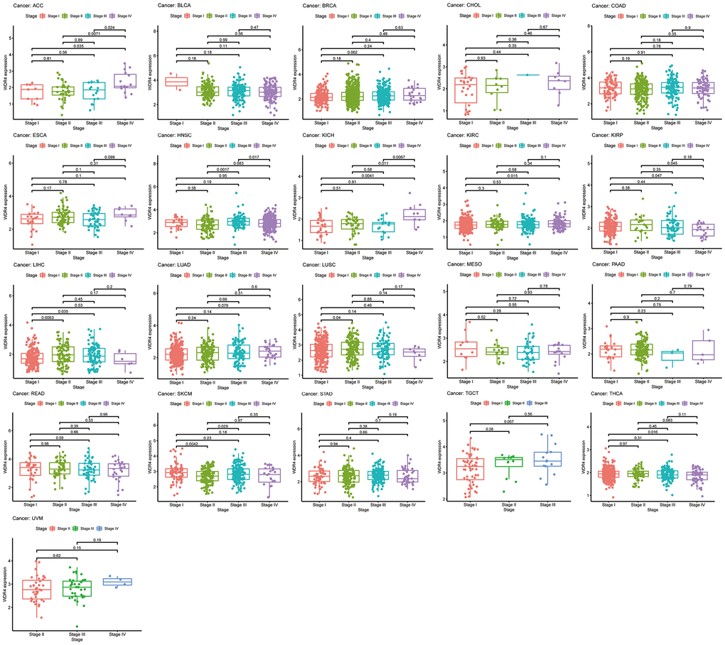 To assess the WDR4 gene expression levels at different cancer stages, we measured WDR4 expression levels in patients with stage I, II, III, and IV disease. As illustrated in Figure 2, WDR4 expression was upregulated at the advanced stages in ACC, HNSC, KICH, KIRC, LUSC, LIHC, SKCM, and THCA, whereas it was downregulated in advanced KIRP tumours and was constant in advanced BLCA, BRCA, CHOL, COAD, ESCA, LUAD, MESO, PAAD, READ, STAD, TGCT, and UVM.