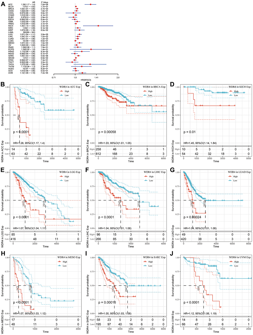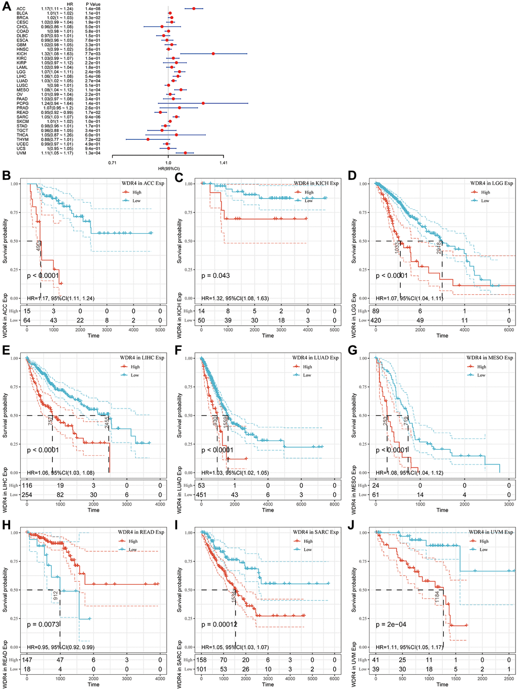 The Cox regression analysis of DSS indicated that high WDR4 expression is a risk factor in ACC (P < .001), BLCA (P < .001), BRCA (P < .001), KICH (P < .001), KIRC (P < .001), LGG (P < .001), LIHC (P < .001), LUAD (P < .001), MESO (P < .001), SARC (P < .001), SKCM (P < .001) and UVM (P < .001), as illustrated in Figure 4A. KM analysis revealed that patients with high WDR4 expression had worse DSS than those with low WDR4 expression in ACC (P < .001), BRCA (P < .001), KICH (P = .01), LGG (P < .001), LIHC (P < .001), LUAD (P < .001), MESO (P < .001), SARC (P < .001) and UVM (P < .001), as illustrated in Figure 4B–4J.