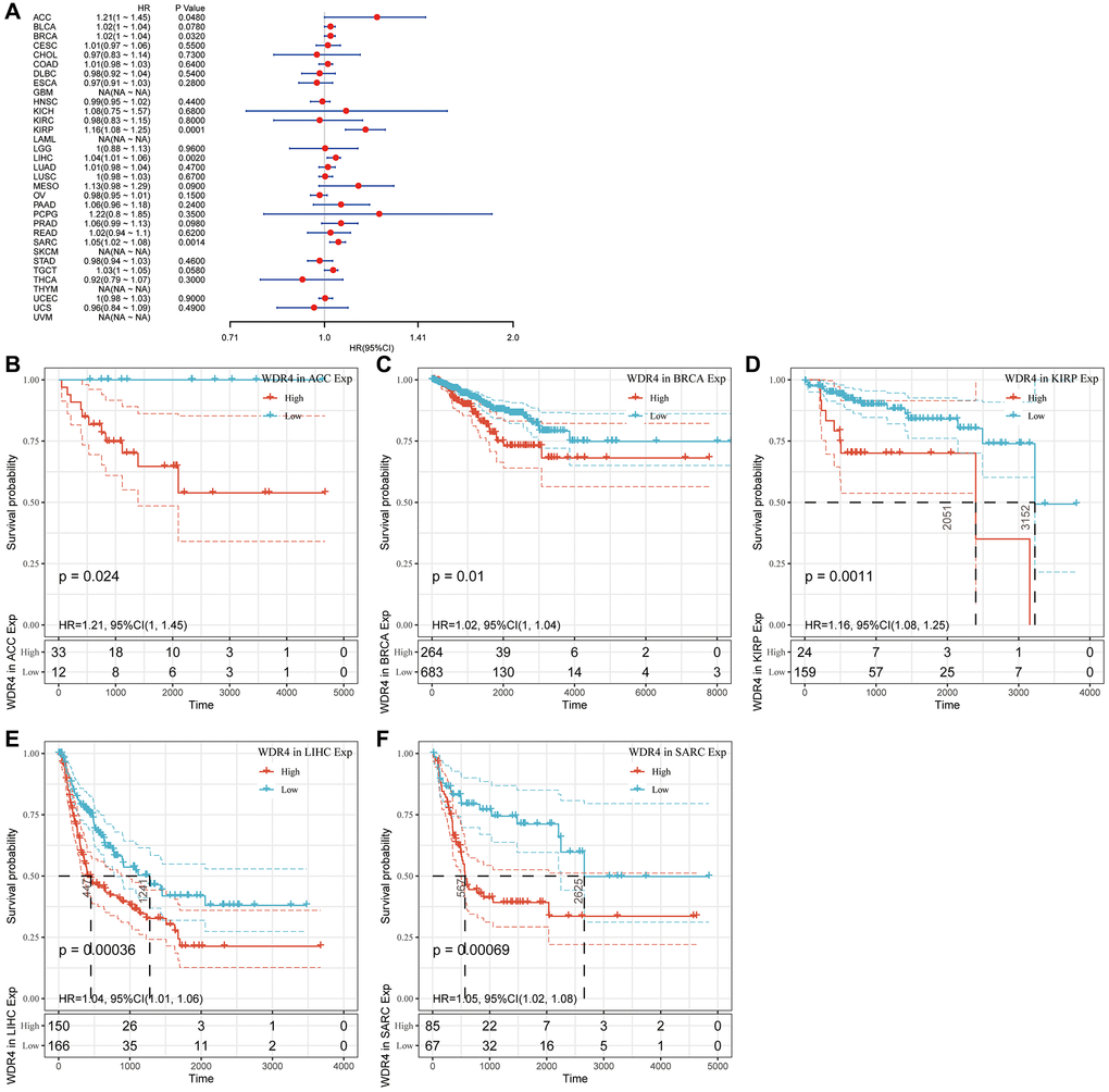 The Cox regression analysis of DFI indicated that higher WDR4 expression was a risk factor in ACC (P = .048), BRCA (P = .032), KIRP (P < .001), LIHC (P = .002), and SARC (P = .0014), as illustrated in Figure 5A. KM analysis showed that patients with higher WDR4 expression had a poorer DFI than those with lower WDR4 expression in ACC (P = .024), BRCA (P = .01), KIRP (P = .0011), LGG (P < .001), LIHC (P < .001) and SARC (P < .001), as illustrated in Figure 5B–5F.