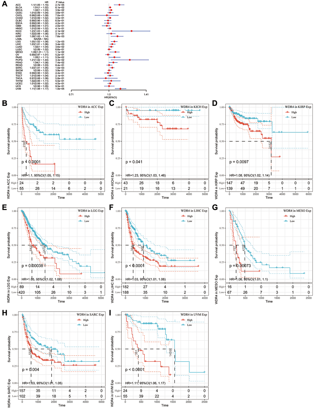 The Cox regression analysis of PFI revealed that higher WDR4 expression is a risk factor in ACC (P < .001), BLCA (P < .001), BRCA (P < .001), KIHC (P < .001), KIRP (P < .001), LGG (P < .001), LIHC (P < .001), LUAD (P < .001), MESO (P < .001), PAAD (P < .001), PCPG (P < .001), PRAD (P < .001), SARC (P < .001) and UVM (P < .001), as illustrated in Figure 6A. KM analysis indicated that patients with high WDR4 expression had a worse PFI than those with lower WDR4 expression in ACC (P < .001), KICH (P < .001), KIRP (P = .0011), LGG (P < .001), LIHC (P < .001), MESO (P = .004) and SARC (P < .001), as illustrated in Figure 6B–6I.