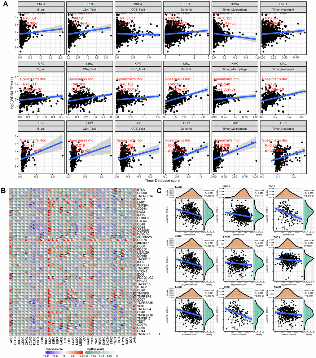 WDR4 expression was typically correlated with the stromal score in LUCS, BRCA, and TGCT, the Est_ImmuneScore in LUCS, SKCM, and THCA, and the ESTIMATE score in LUSC, TGCT, and SKCM (Figure 7C).