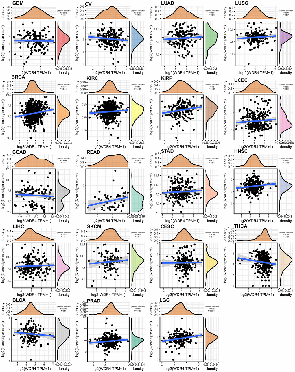 As shown in Figure 8, WDR4 expression was negatively associated with neoantigens in GBM, OV, COAD, CESC, THCA, and BLCA but positively correlated with neoantigens in LUAD, LUSC, BRCA, KIRC, KIRP, UCEC, READ, STAD, HNSC, LIHC, SKCM, PRAD, and LGG.