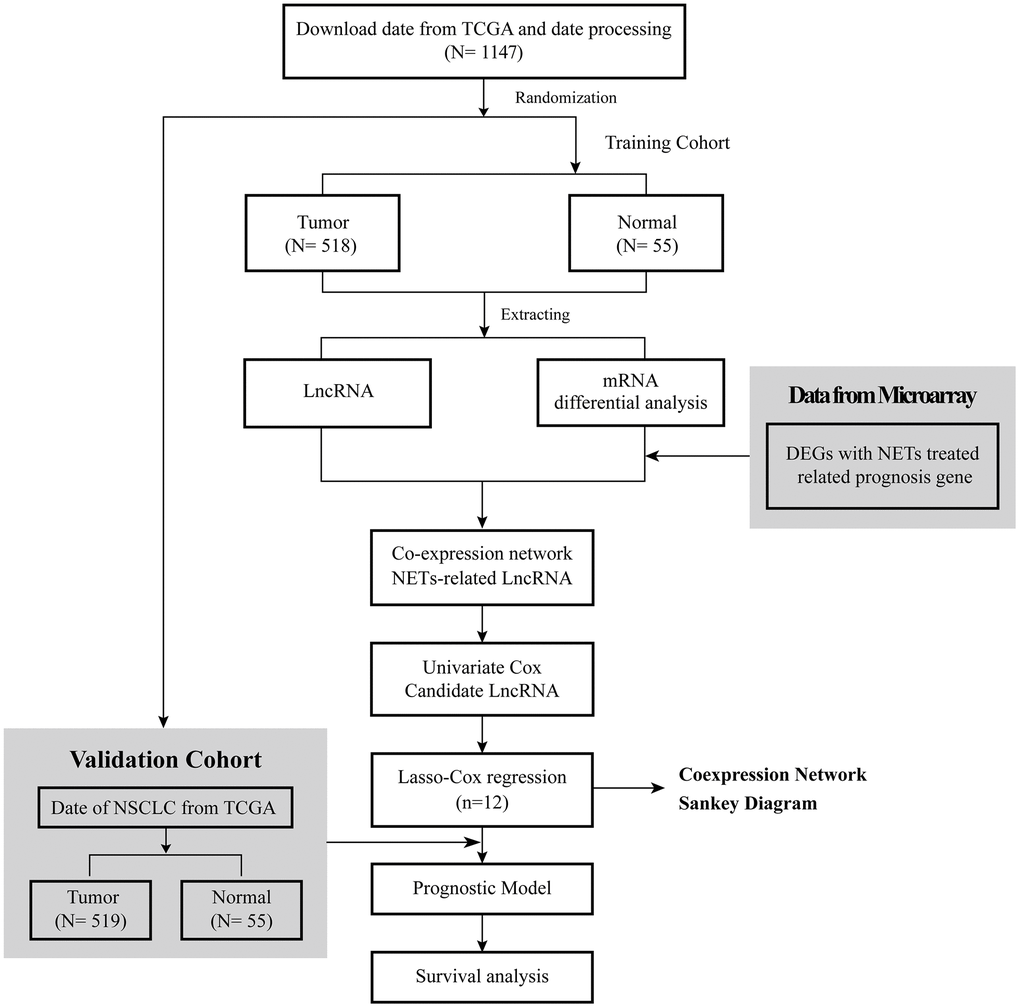 Long noncoding RNAs (lncRNAs) [11], recognized as transcripts of more than 200 nucleotides that cannot be translated into proteins, were identified to execute an extensive range of functions in various crucial biological activities, such as cell proliferation and differentiation, genetic regulation of gene expression, action variation of the transcriptome, and microRNA (miRNA) regulation [12]. Importantly, lncRNAs contribute to the development of NSCLC in proliferation, migration, invasion, and chemoresistance [13, 14]. Previous studies have commonly focused on a single or a few lncRNAs for NSCLC [14–16]. Moreover, NETs-related lncRNA expression profiles have not yet been developed to explore novel biomarkers for forecasting the prognosis of NSCLC. Meanwhile, whether NETs encourage the malignant phenotype of NSCLC through some lncRNAs remains largely unknown. Consequently, we aimed to utilize bioinformatics to establish NETS-related lncRNA signatures and to seek new biomarkers to predict the prognosis of patients with NSCLC.