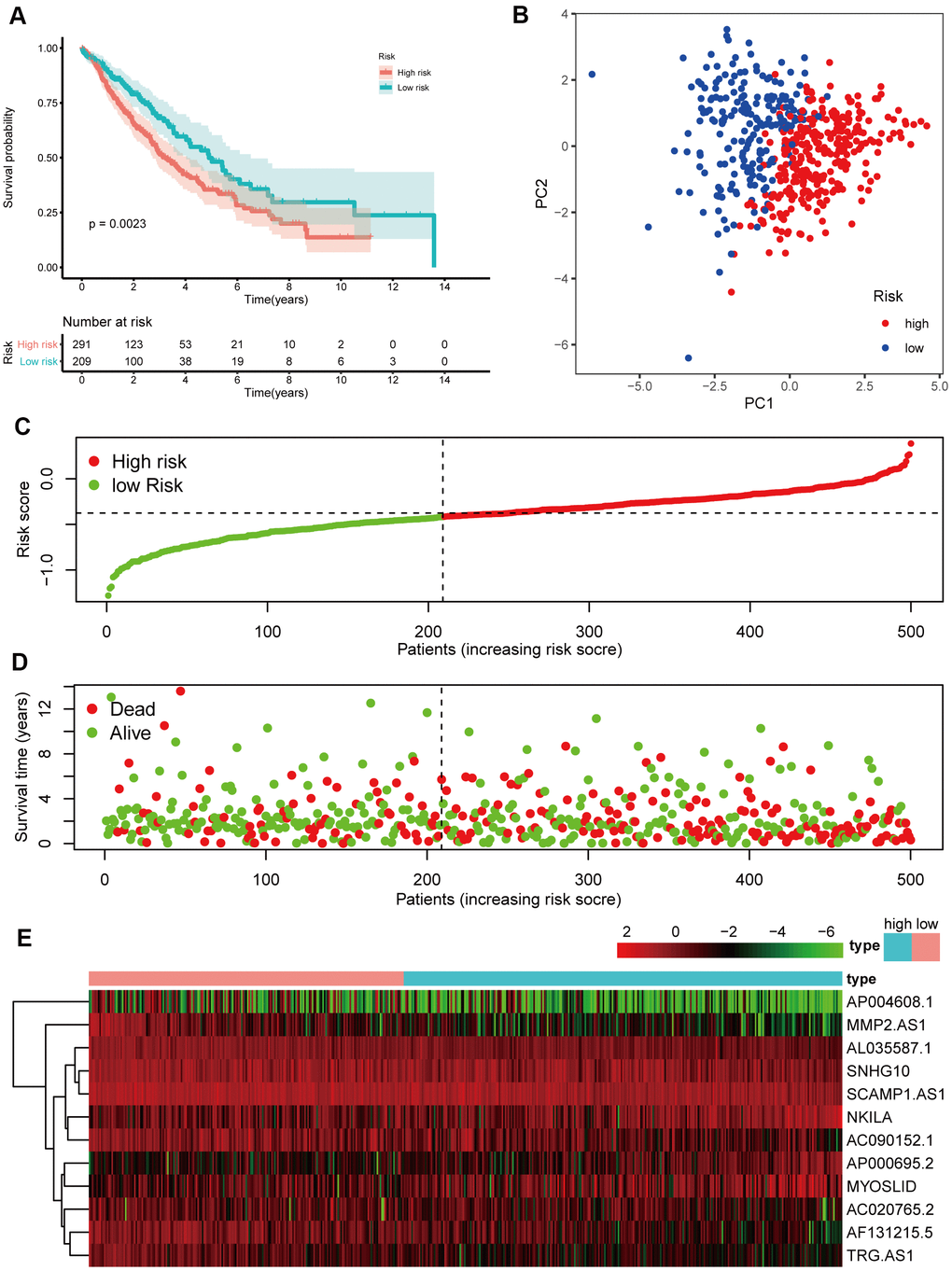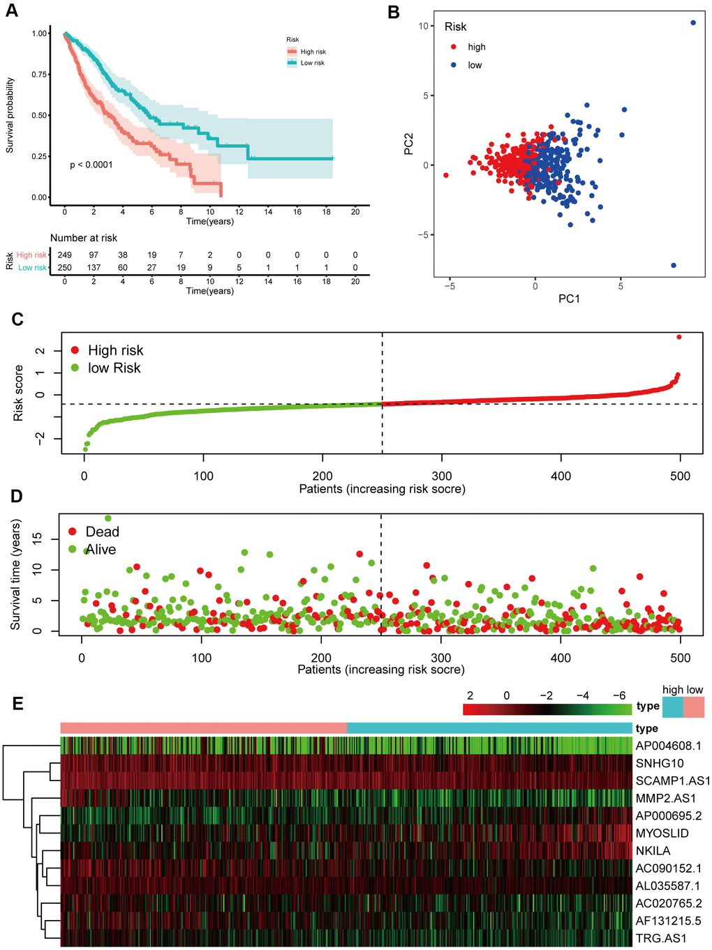 A prognostic model based on the 19 lncRNAs referenced above was built following univariate Cox regression analysis, and 12 lncRNAs were determined through Lasso Cox regression based on 19 lncRNAs. The formula, risk score = 0.044 * expression level of AC020765.2 + 0.079 * expression level of AC090152.1 + 0.133 * expression level of AF131215.5 + 0.067 * expression level of AL035587.1 + 0.044 * expression level of AP000695.2 + 0.059 * expression level of AP004608.1 + 0.216 * expression level of MMP2.AS1 + 0.006 * expression level of MYOSLID + 0.076 * expression level of NKILA + 0.018 * expression level of SCAMP1.AS1+ 0.027 * expression level of SNHG10+ 0.063 * expression level of TRG.AS, was utilized to calculate the risk score. By evaluating these 12 NETs-related lncRNAs, we were able to acquire the risk score of each patient. The patients were divided into a high-risk group (n=241) and a low-risk group (n=241) in accordance with the risk score (Figure 5C). Next, the Kaplan-Meier curve suggested that patients in the high-risk group had a significantly worse OS than their low-risk counterparts (Figure 5A, P < 0.05). Additionally, PCA indicated that the patients in different risk groups were distributed in two directions (Figure 5B). Patients with high risk had a higher probability of earlier death than those with low risk (Figure 5D, 5E).
