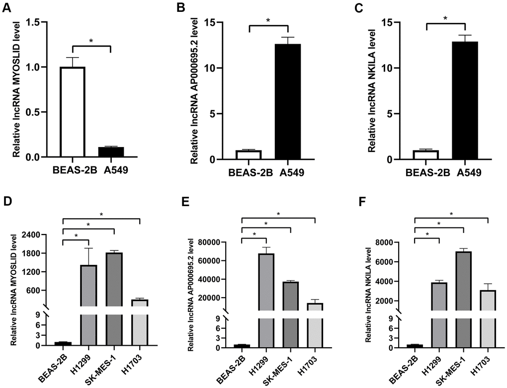 Total RNA from the BEAS-2B, A549, H1299, SK-MES-1, and H1703 cell, according to the manufacturer’s specification, was separated using Trizol (Invitrogen, Carlsbad, USA). Then, the first-strand cDNA at a volume of 20μL was compound by using the reverse transcription kit and finally diluted to 100uL. Quantitative real-time polymerase chain reaction (RT-qPCR) analyses were processed utilizing an SYBR Green mix in the Real-Time PCR System (TAKARA, Kyoto, Japan). 20μL of PCR reaction was prepared as follows: 10μL of 2×SYBR Green PCR master mix, 1 μL of 10μM of suitable forward and reverse primers, 7μL of RNase-free water, and 2μL of cDNA template. RT-qPCR was performed for 10 minutes at 95° C, followed by 40 cycles of 5 seconds at 95° C and 30 seconds at 60° C. A dissociation melting curve was generated using thermal conditions from 60° C to 95° C. Human GAPDH was employed as an internal housekeeping reference. The sequences for all primers were as follows: NKILA (forward primer): GGCTAGTCTGGCTGGGAGAAGTC; (reverse primer): AGCGTTGTGGGTAGGTTTGGTTTC. MYOSLID (forward primer): TCTGCCTAGTCCTGCTGCCTTC; (reverse primer): ATGGGAAGCTGTGTTCACTTTGGG; AP000695.2 (forward primer): CGGAAGCCACCACATGACCTTG; (reverse primer): TTCCAACCGCATGGGTGAAAGTC. GAPDH (forward primer): GTCAGTGGTGGACTGACCT; (reverse primer): TGCTGTAGCCAAATTCGTTG.