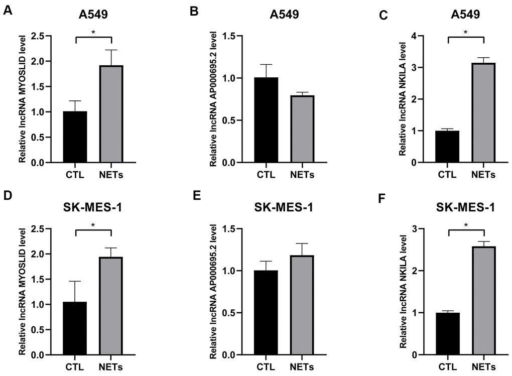 As mentioned before, survival data analyses clearly revealed that AP000695.2, MYOSLID, and NKILA were unfavorable prognostic factors. Here, we conducted further verification to understand the characteristics of these 3 lncRNAs at the cell level. As shown in Figure 8A–8C, the levels of AP000695.2 and NKILA in A549 cell were much higher than those in human normal epithelial lung cells (BEAS-2B), whereas the expression of MYOSLID in the A549 cells was lower. The expression levels of 3 lncRNAs, namely, AP000695.2, MYOSLID, and NKILA, in NSCLC cells (H1299, SK-MES-1, H1703) was distinctly higher than those in BEAS-2B, as detected by RT-qPCR (Figure 8D–8F). Therefore, we tested the 3 lncRNAs that were expressed at higher levers in A549 and SK-MES-1 cells following NETs treatment or not for 12 h (Figure 9A–9F), and the results showed that the expression levels of MYOSLID and NKILA were elevated in both NSCLC cells lines after NETs treatment for 12 h (P < 0.05).