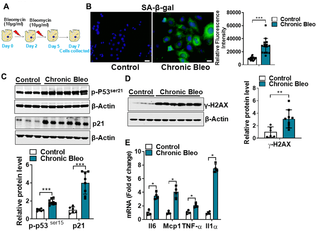 Cellular senescence is key characteristic of the alveolar epithelium in IPF. With this in mind, we first sought to develop an injury protocol that could reliably induce this pathological feature [12, 16–18]. After screening various concentrations [10, 25, 50 μg/ml), durations (24 or 48 hr), and frequencies (every 48 or 72hr) of bleomycin in MLE12 cells, we uncovered a protocol (Figure 1A) that reliably induced features of senescent cells. This included causing the characteristic flattening and enlarging of cell shapes as well as the suppression of cell proliferation (data not shown). We also detected an upregulation in β-galactosidase activity (Figure 1B), and higher expression of multiple cellular senescence markers, including the cell cycle inhibitors p21 and p53, the DNA damage marker γ-H2AX and the SASPs IL-6, MCP1, TNF-α, and IL-1α (Figure 1C–1E). Altogether, these findings indicate that our unique 7-day injury protocol induces multiple characteristic features of senescent IPF cells.
