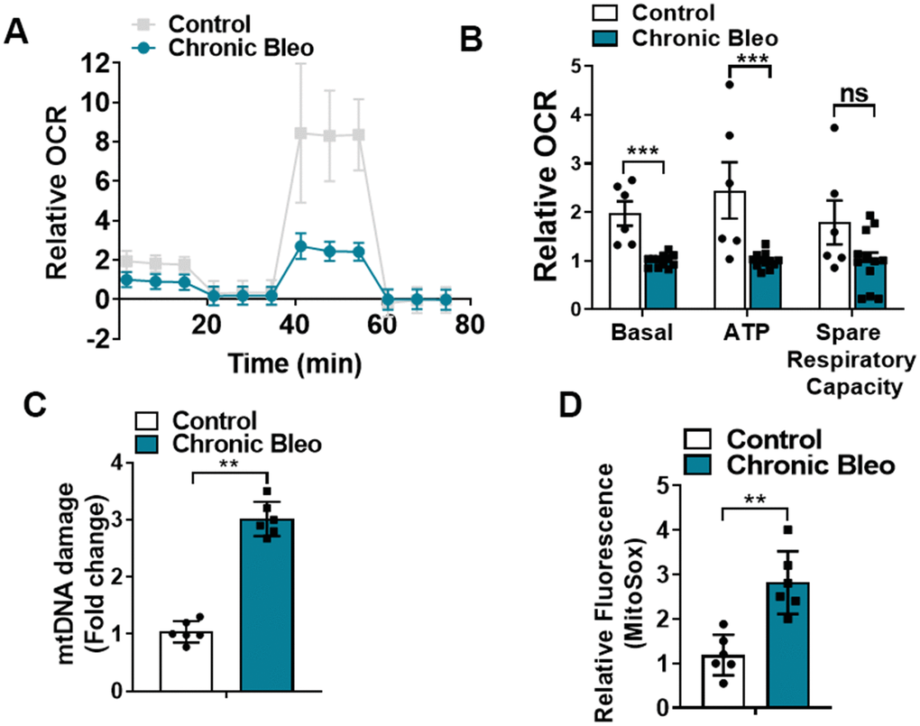 Growing evidence indicates that aging and cellular senescence are tightly interrelated to mitochondrial dysfunction [13, 30]. Accumulation of dysmorphic/dysfunctional mitochondria have been described in various aging tissues, including AE2 cells in the lungs of IPF patients. In addition, senescent IPF lung fibroblasts show diminished oxidative phosphorylation and increased ROS production, possibly perpetuating the senescence phenotype by promoting ROS-mediated molecular damage. In our study, repeated exposure to low dose bleomycin in MLE12 cells increased ROS levels, suggesting a similar auto-amplifying loop of mitochondrial-derived ROS and senescence. Our results support the free radical theory as a potential explanation for the decline in mitochondrial function [2, 31, 32], although we consider that recently proposed mechanisms, such as decreased PINK1 expression should also be investigated.