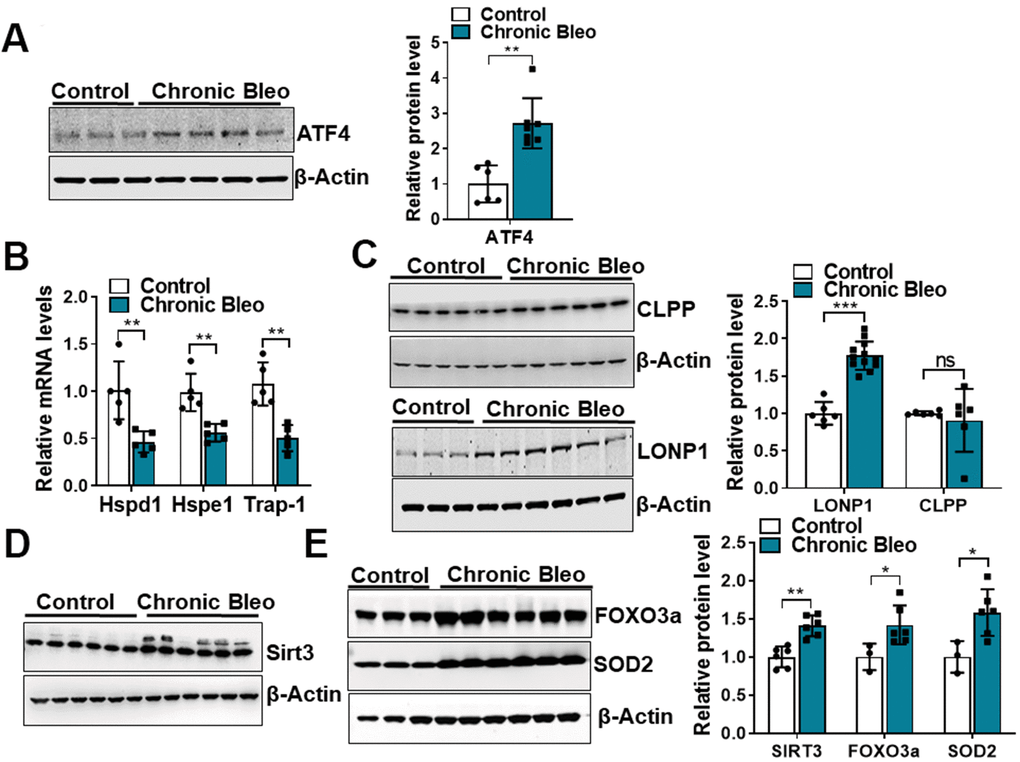 Like cellular senescence, mitochondrial dysfunction has emerged as a key feature of the alveolar epithelium in IPF. To determine whether mitochondrial dysfunction was altered in our model system, we began by comparing mitochondrial oxygen consumption rates (OCR) between control and injured cells. Consistent with altered mitochondrial function, we found that OCR was significantly reduced in cells undergoing our injury protocol. This included a nearly 50% reduction in basal respiration as well as an even greater decline in ATP production (Figure 2A, 2B). Further, we found that DNA damage and redox balance (Figure 2C, 2D) were altered in these cells and we detected higher expression of ATF4, a transcriptional regulator of the mitochondrial unfolded protein response (UPRmt) (Figure 3A). Consistent with the upregulation in ATF4, we observed an increase in several of its downstream targets, including the mitochondrial chaperone proteins Hspd1, Hspe1 and Trap1 and mitochondrial proteases CLPP and Lonp1 (Figure 3B, 3C). Lastly, we detected mitochondrial changes not yet described in the alveolar epithelium of IPF patients, such as an increase in levels of the deacetylase SIRT3, the transcription factor forkhead box O3a (FOXO3) and the antioxidant enzyme superoxide dismutase 2 (SOD2) (Figure 3D, 3E), suggesting our model can help to uncover new mechanisms in the pathogenesis of disease.
