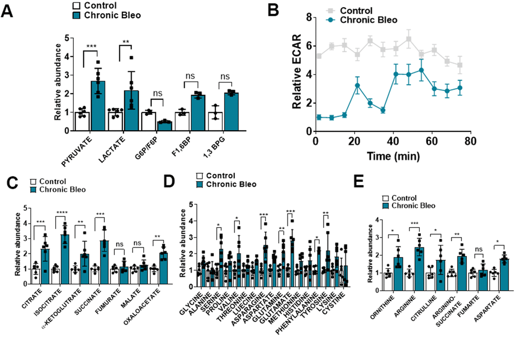 Another recently described feature of IPF cells is dysregulated cellular metabolism [19–22]. To determine whether cellular metabolism was affected in our model, beyond the changes already described in OCR, we measured levels of different metabolites by LC/MS in control and injured cells. Consistent with findings described in IPF, we uncovered significantly higher levels of lactate in injured cells [23]. This also associated with elevated pyruvate levels and a trend toward higher levels of fructose 1,6-biphosphate (F1,6BP) and 1, 3-bisphosphate glycerate (1,3 BPG) (Figure 4A), suggesting glycolysis was upregulated in these cells. However, this did not correlate with higher extracellular acidification rates (levels were actually significantly lower), suggesting, at the very least, that lactate secretion was reduced in injured cells (Figure 4B). In addition to elevated levels of glycolytic intermediates, we also detected higher levels of several TCA cycle intermediates (citrate, isocitrate, α-ketoglutarate and succinate) (Figure 4B) and various amino acids, including the nitrogen-rich amino acids glutamine, asparagine and arginine (Figure 4C) [24, 25]. Consistent with altered nitrogen balance, multiple metabolites of the urea cycle were increased in our bleomycin-injured MLE12 cells (Figure 4E).