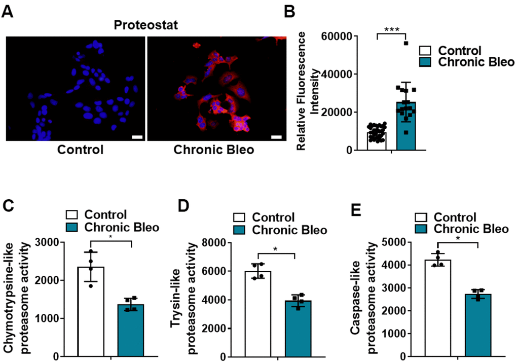 Altered proteostasis in IPF is associated with the accumulation of aggregated proteins, defective autophagy, ER stress, and decline in proteasome activity [43–46]. Supporting the notion that our model mimics pathologic changes in IPF, we showed that aggregated proteins accumulate in MLE12 cells undergoing our protocol. Further, we showed that chymotrypsin-, trypsin- and caspase-like activities were significantly reduced and this associated with decreased levels of several protein subunits of the 26S proteasome. Together, these findings suggest that proteasome dysfunction might contribute to protein aggregation in IPF. Emerging evidence suggests that NRF1 is critically important for regulating proteasome activity in response to protein stress. To date, the role of NRF1 has not investigated in IPF. However, our findings suggest that reduced expression of NRF1 could contribute to loss of proteostasis, providing a potential new direction for the field. Interestingly, Sotzny et al. reported an upregulation of NRF1-dependent proteasome expression upon administration of rotenone, a known inducer of mitochondrial dysfunction, highlighting the possibility that mitochondrial dysfunction and loss of proteostasis are mechanistically linked [47].