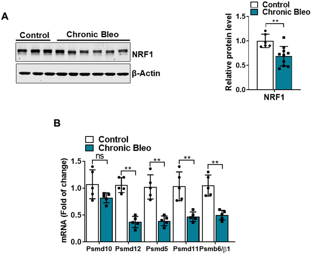 Another defining feature of IPF cells is a loss of proteostasis. For example, mutations causing the misfolding of surfactant proteins are linked to familial forms of IPF and misfolded and aggregated proteins have been shown to accumulate in the alveolar epithelium of patients with sporadic forms of disease [26, 27]. To assess whether proteostasis was altered in our model system, we first assessed levels of intracellular protein aggregates in injured vs uninjured cells. Consistent with impaired proteostasis, we found that intracellular protein aggregates were significantly increased in injured cells (Figure 5A, 5B). Further, this associated with homeostatic changes in the ubiquitin proteasome system (UPS), including marked reduction in chymotrypsin-, trypsin-, and caspase-like activities (Figure 5C, 5E) as well as significant accumulation of K48-linked ubiquitinated proteins (data not shown). Further, we detected reduced levels of various UPS proteins, such as the transcriptional regulator Nuclear E2-related factor 1 (NRF1) (Figure 6A), and several key components of the 26S proteosome (Psmd12, Psmd5 and PsmbB6/β1) (Figure 6B).
