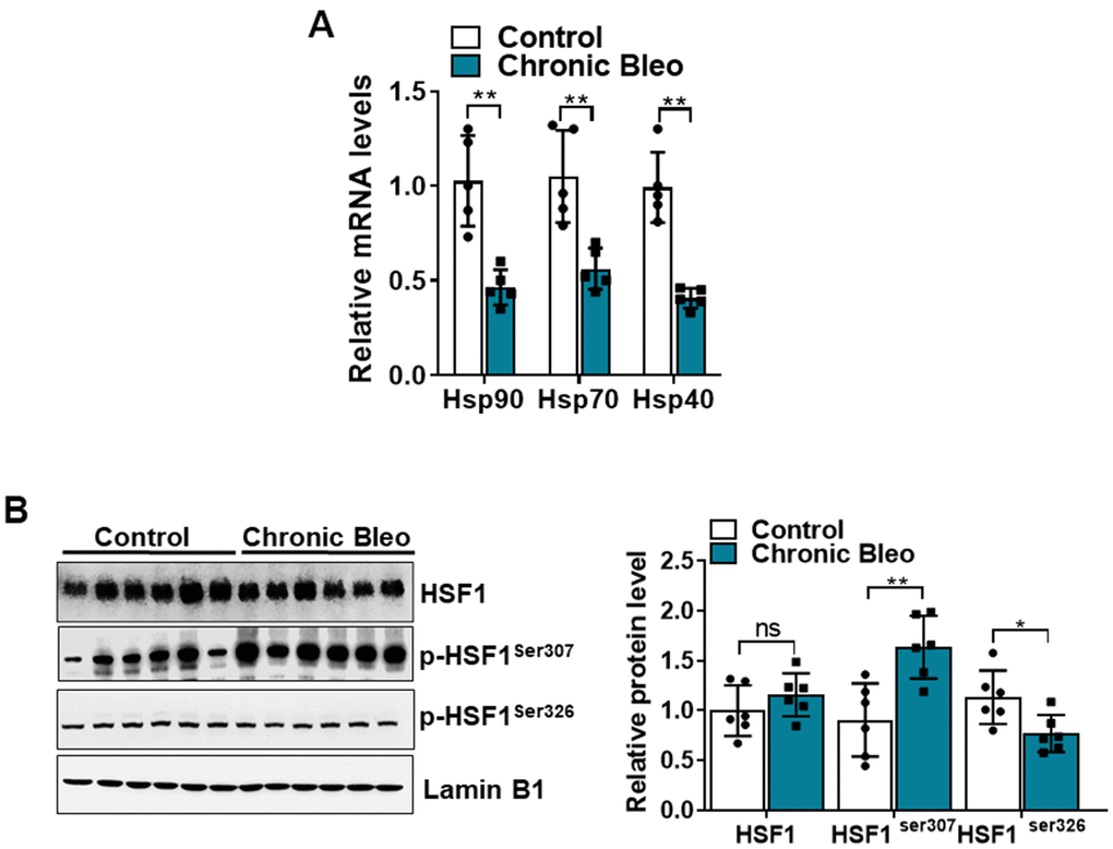Heat shock proteins (HSPs) are cytoprotective chaperones that in conjunction with the proteasome are important to maintain proteostasis [48]. Hsp70 levels are decreased in IPF fibroblasts and Hsp70-knockout mice demonstrate accelerated pulmonary fibrosis after bleomycin administration [48]. In contrast, HSP90 is overexpressed in IPF lung fibroblasts and inhibition of this chaperone attenuated the progression of pulmonary fibrosis. We recently demonstrated that reduction in HSF1 activation plays a central role in reducing chaperone levels in lung fibroblasts [49]. In this study, we show that HSF1 activation, was significantly reduced in injured cells. Reduced expression of HSF1 has been shown to cause senescence by eliciting proteostasis collapse, thereby compromising the ability of cells to perform essential activities. It is now appreciated that increased post-transcriptional modifications, induced via phosphorylation can also contribute to impaired HSF1 activity [50, 51]. In support of this concept, we detected a marked increase in Ser307 phosphorylation in our chronically injured cells.