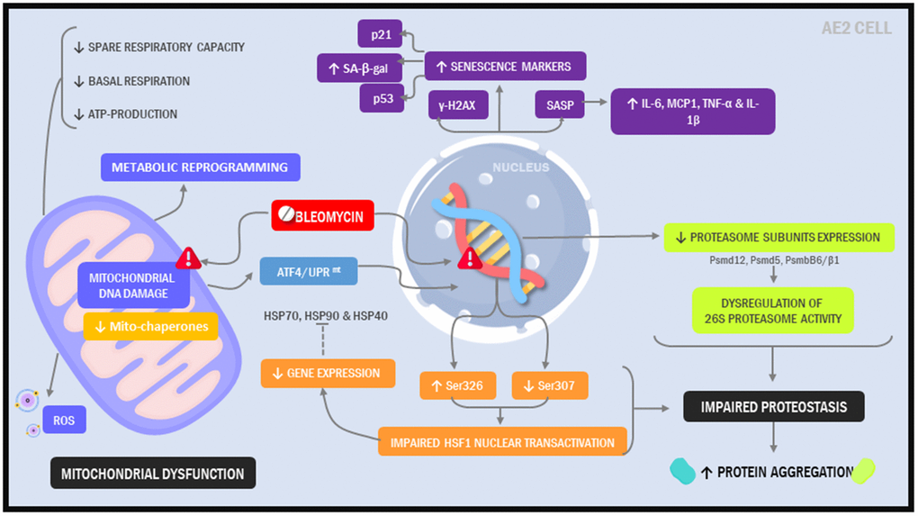 Bleomycin is a chemotherapeutic agent whose actions have been extensively studied. Although multiple mechanisms are linked to its anti-tumor activities, bleomycin is believed to primarily mediate its effects through chelation of metal ions and the subsequent production of toxic reactive oxygen species. With this in mind, our model appears to support the DNA damage theory of aging, in which functional decline with age is thought to be driven by progressive genomic DNA damage. Given the ability to precisely time the initiation of our insults, our model is ideally suited for uncovering the temporal relationship among DNA damage, mitochondrial dysfunction, metabolic dysregulation and loss of proteostasis.