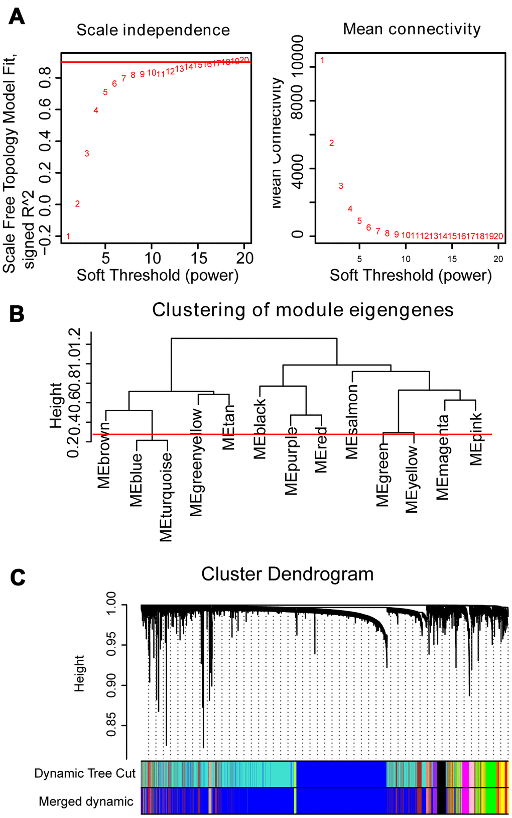 The details of the WGCNA algorithm were conducted by the R package “WGCNA” and were described in our previous publications [58–60]. Firstly, we used the sample dendrogram clustering method to remove the obvious outlier samples with too many missing entries for outlier detection and showed in a clinical trait heat map. Secondly, based on the criteria of approximate scale-free topology and mean connectivity, the soft-threshold power was calculated by the pickSoftThreshold function of WGCNA. Thirdly, we calculated adjacencies using best-fit soft-threshold power, transformed the adjacency into a topological overlap matrix (TOM), and calculated the corresponding dissimilarity TOM (dissTOM). Finally, after hierarchical clustering analysis based on the dissTOM, modules were generated by the dynamic tree cut method for module merging (the cut-off line at 0.25).