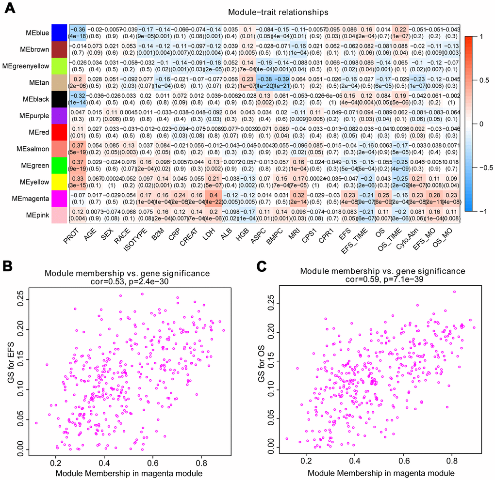 The correlation between module eigengenes and clinical traits of MM was showed in the heat map of Figure 2A. Module magenta was significantly related to event-free survival (EFS) (p=4e-08) and OS (p=6e-09). In addition, the module magenta had the highest GS relating to EFS (p value=2.5e-130) and OS (p value=9e-251) in boxplot (Supplementary Figure 3). Therefore, the magenta module containing 400 eigengenes was used for subsequent analysis. As a result, the relationships between module membership and gene significance of 400 hub eigengenes from the magenta module for OS and EFS were significant, implying that hub genes in the scatter plot also tend to be highly correlated with OS and EFS (Figure 2B, 2C).