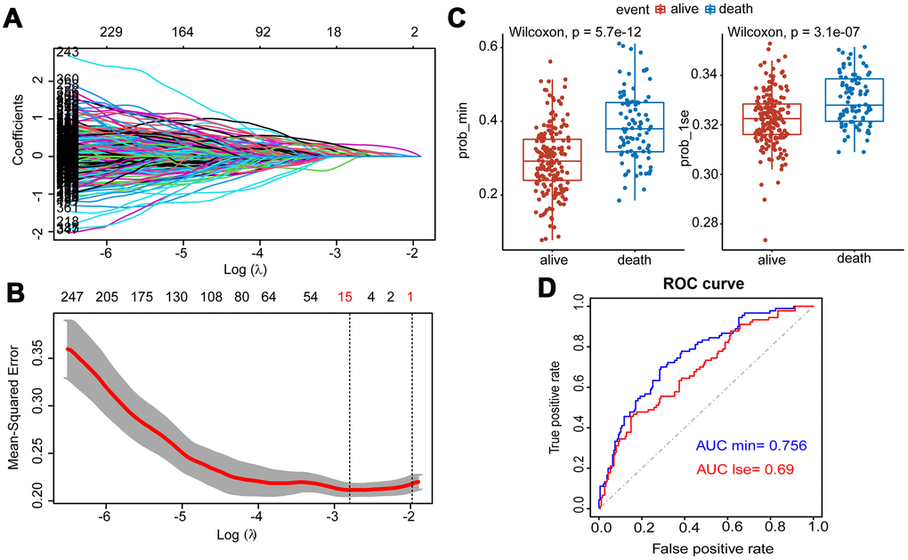 After the Lasso was performed using 400 hub eigengenes using the training dataset, the coefficients were shown in Figure 3A. Genes with non-zero coefficients were considered to have strong prognostic potential in the Lasso penalized regression model. Two tuning parameters (Log λ.min = -2.86 and Log λ.1se = -1.96) were obtained using 10-fold cross-validation via minimum criteria (Figure 3B). Therefore, the fifteen-gene group and one-gene group were obtained based on Log λ.min and Log λ.lse. Wilcoxon test showed that the fifteen-gene group had better survival prediction potential than the one-gene group in MM patients (p<0.05) (Figure 3C). The ROC curves showed that the AUCs of the fifteen-gene group and the one-gene group were 0.756 and 0.69, respectively, indicating that the fifteen-gene group had a more predictive ability of prognosis (Figure 3D).