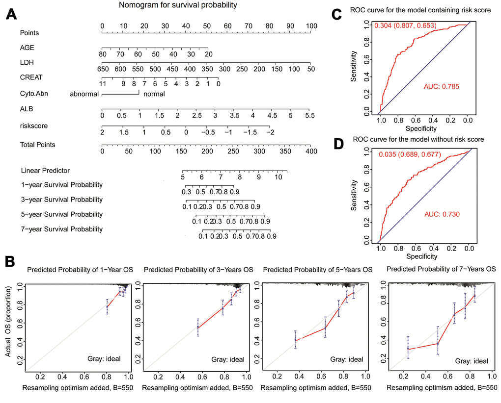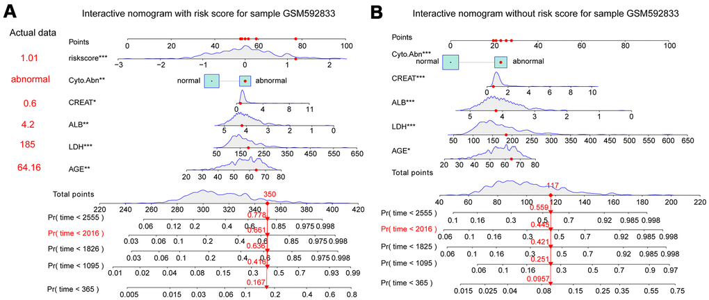 Clinical traits and the fifteen-gene risk score were also analyzed by univariate and multivariate Cox regression to identify the survival-related variable. The risk score and clinical signatures including AGE, CREAT, LDH, ALB, Cyto_Abn were found to be significantly related to OS (p<0.05) (Supplementary Table 2). Since five clinical traits and risk scores were vital variables for the prediction of OS of MM, we rebuilt the multivariate Cox regression model and visualized it by nomogram. Total points were summated by adding each point of AGE, CREAT, LDH, ALB, Cyto_Abn, and the fifteen-gene risk score (Figure 7A). The calibration curves of 1 to 7-year survival demonstrated favorable prediction performance of nomogram (Figure 7B). To illustrate the significant influence of the fifteen-gene risk score in the nomogram, the ROC curve further verified that AUC for the model containing the risk score was 0.785, higher than 0.730 without risk score (Figure 7C, 7D). Meanwhile, the C-index of the model with the risk score was 0.754, higher than 0.722 of the C-index without the risk score (Table 2). The patient sample of GSM592833 was randomly selected and used to illustrate the nomogram (Figure 8A, 8B). It should be noted that the patient died on the following day of 2016. The death probability of this sample was 0.661 predicted by nomogram with a risk score, but only 0.445 predicted by the nomogram without risk score. These results indicate that the nomogram with risk score has better predictive performance thus is more reliable. According to the equation of nomogram, after inputting the values of clinical traits and risk score, the prediction of OS was estimated via nomogram tool in Microsoft Excel (Supplementary Table 3).