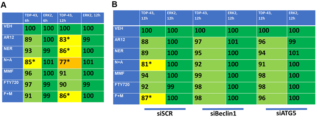 As presented in Figure 3, fingolimod and MMF interact to cause autophagosome formation and subsequently to promote autophagic flux. As was observed for AR12 and neratinib, fingolimod and MMF interacted to reduce the expression of wild type and mutant Tau 301L proteins (Figure 9A). Knock down of Beclin1 or ATG5 prevented Tau degradation (Figure 9B). An addition protein, beyond TAU and APP, that has been linked with the biology and pathology of AD is TDP-43 [1–8]. AR12 and neratinib, and MMF and FTY720, interacted to reduce the expression of TDP-43 (Figure 10A). Knock down of Beclin1 or ATG5 prevented either combination from reducing TDP-43 levels (Figure 10B).