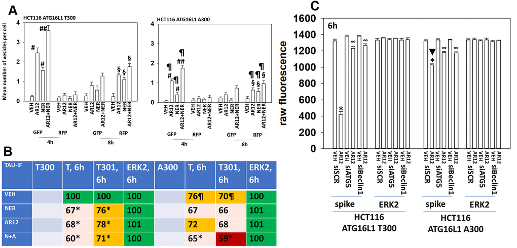 The autophagy regulatory protein ATG16L1 is expressed as two isoforms, ATG16L1 T300 and ATG16L1 A300. The ATG16L1 T300 is most commonly found in Africans and their descendants whereas the highest prevalence of ATG16L1 A300 expression is in northern Europeans and their descendants. Expression of ATG16L1 A300 predicts for a higher incidence of Crohn’s Disease in European Americans [49]. In comparison to isogenic HCT116 cells expressing ATG16L1 T300, cells expressing ATG16L1 A300 were significantly less capable of forming autophagosomes or exhibiting autophagic flux when treated with AR12 and neratinib (Figure 11A). This is similar to prior studies using other drugs / drug combinations which induce autophagosome formation. We next determined whether the differential ability of each isoform to facilitate autophagy also impacted the ability of neratinib and AR12 to cause Tau protein degradation. As would be predicted from the data in panel A, cells expressing ATG16L1 A300 were less capable of reducing Tau expression (Figure 11B). We were surprised, however, to observe also that HCT116 ATG16L1 A300 cells were less capable of expressing Tau than were their isogenic HCT116 ATG16L1 T300 counterparts. Tau is being expressed from a plasmid via a constitutive promoter. To determine whether this effect was specific to Tau, we transfected cells with a plasmid and a constitutive promoter to express the SARS-CoV-2 spike protein. The ability of ATG16L1 T300 and ATG16L1 A300 cells to express the spike protein was identical (Figure 11C). And the ability of AR12 cells to cause spike degradation was reduced in the ATG16L1 A300 cells. As African-Americans trend to present with a more rapid onset and severe Alzheimer’s disease when compared to European Americans, we postulate that ATG16L1 isoform expression may play a role.