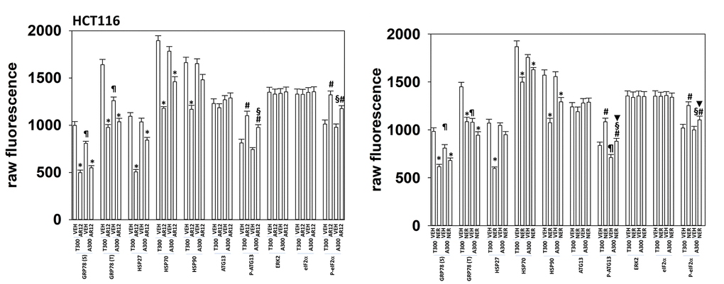 We extended our analyses of the biologies of HCT116 ATG16L1 T300 and HCT116 ATG16L1 A300 cells to determine whether altered chaperone levels, or drug responses, could provide clues as to why more Tau was expressed in the T300 cells. Regardless of isoform expression, cells expressed similar levels of HSP90 and HSP70, whereas expression of GRP78 was lower in the ATG16L1 A300 isoform cells (Figure 12). This was observed for cell surface levels of GRP78 and for bulk cellular GRP78. Although cells regardless of their isoform exhibited near identical levels of total ATG13 and total eIF2α, the phosphorylation of these proteins caused by either AR12 or neratinib was altered. In cells expressing ATG16L1 A300, the ability of AR12 and neratinib to stimulate ATG13 S318 phosphorylation (autophagy) and eIF2α S51 phosphorylation (ER stress) were reduced. Basal phosphorylation of ATG13 S318 trended towards being lower in the A300 cells (Figure 12). These findings may partially explain why cells expressing ATG16L1 A300 do not produce as many autophagosomes when stimulated as do ATG16L1 T300 cells.