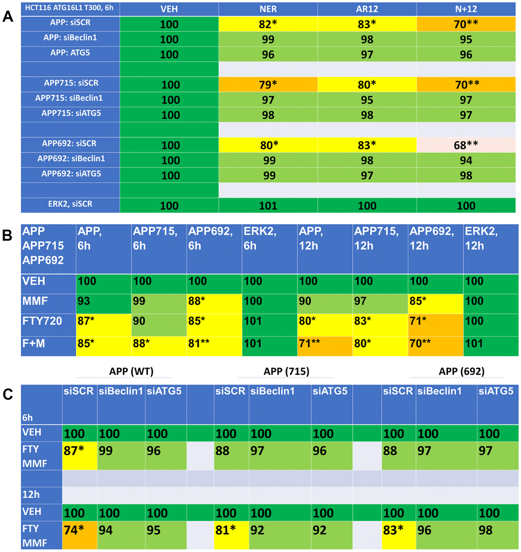 In addition to denaturation of Tau, AD also contains denatured beta-amyloid plaques. Hence, we next determined whether our drug combinations could reduce the expression of wild type amyloid precursor protein (APP) or of the mutant forms of this protein APP692 and APP715. AR12 and neratinib both reduced APP expression and interacted to cause a further reduction in protein levels (Figure 13A). Knock down of Beclin1 or ATG5 prevented APP degradation. As single agents, fingolimod and MMF were apparently less efficacious than AR12 and neratinib at reducing the levels of the tested APPs (Figure 13B). However, fingolimod and MMF did interact to cause a further reduction in APP expression. Knock down of Beclin1 or ATG5 also significantly reduced the ability of fingolimod and MMF to reduce APP expression (Figure 13C). Collectively, our findings in Figures 4–13 support the further evaluation of AR12, neratinib, fingolimod and MMF as repurposed treatments for pathologies such as AD.