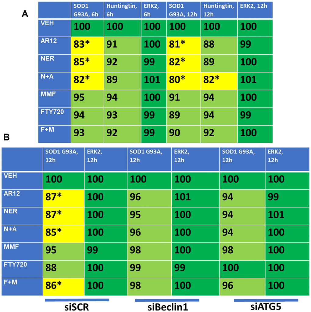 As noted previously, other lethal neurological diseases are also caused by accumulation of denatured toxic proteins including SOD1 G93A in ALS and Huntingtin in HC. Thus, based on our data with APP and Tau we determined whether our drug combinations could reduce the protein expression of SOD1 G93A and CAG 145 repeat Huntingtin. AR12 and neratinib interacted to reduce the expression of SOD1 G93A and Huntingtin, with Huntingtin being relatively less capable of being down-regulated (Figure 14A). In contrast to AR12/neratinib, and different to our findings with APP and Tau, fingolimod and MMF were ineffective at reducing protein expression. Knock down of Beclin1 or ATG5 prevented the drug-induced degradation of SOD1 G93A (Figure 14B). Additional studies will be required to understand why fingolimod and MMF did not cause significant amounts of degradation for these specific proteins.